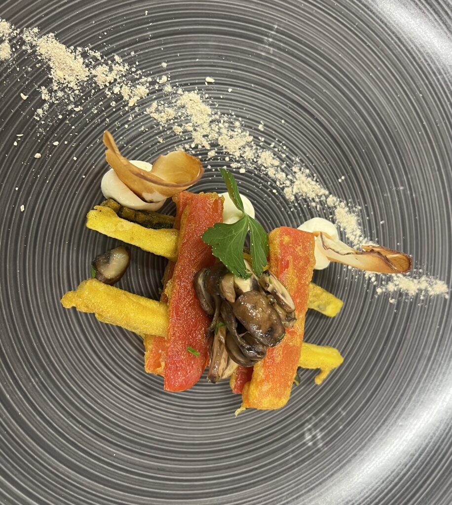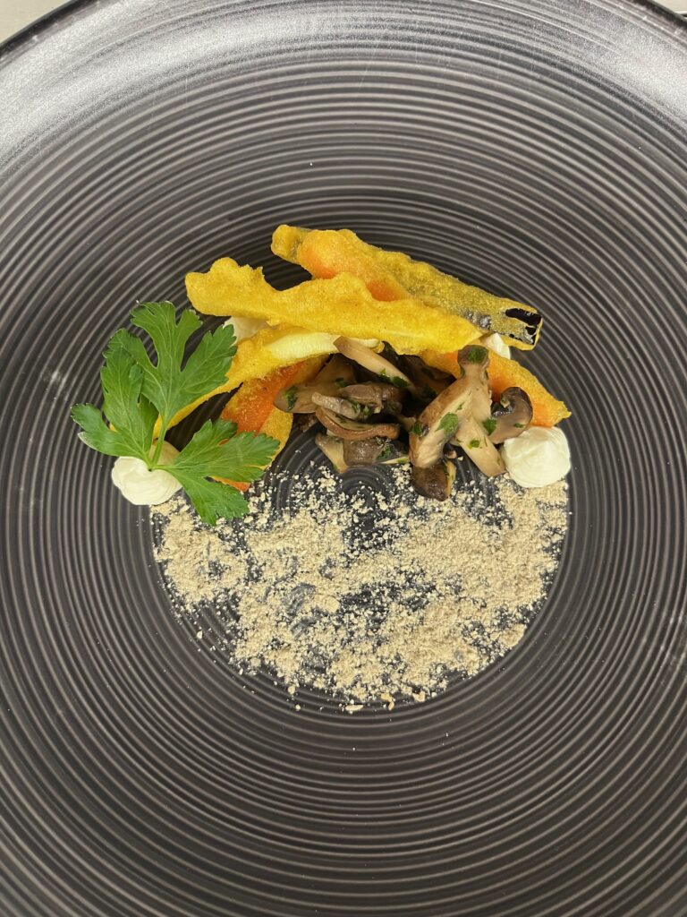 Pilze sautieren, pürieren, mit Gelatine fixieren. Anrichten: Scheibe, Trüffelöl, Toast-Chip.