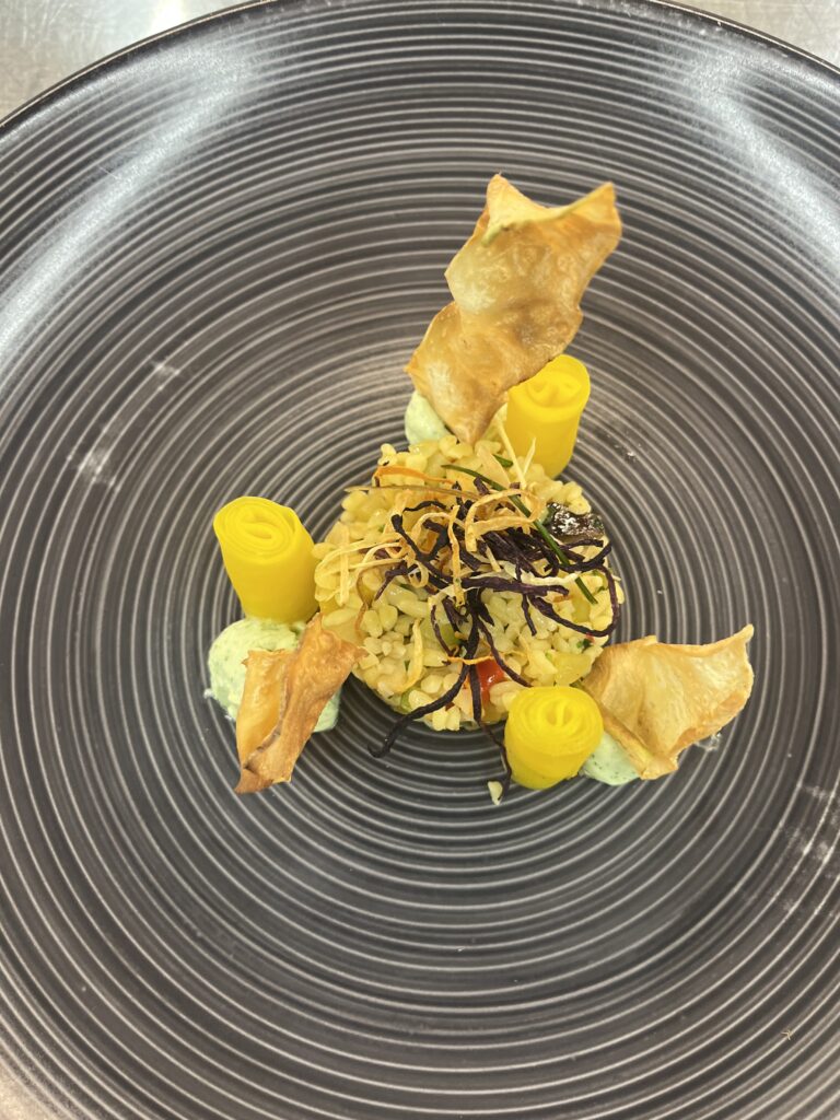 Karotten dünsten, pürieren, mit Ingwer & Agar gelieren. Anrichten: Terrine in Scheiben, Sesam bestreuen.