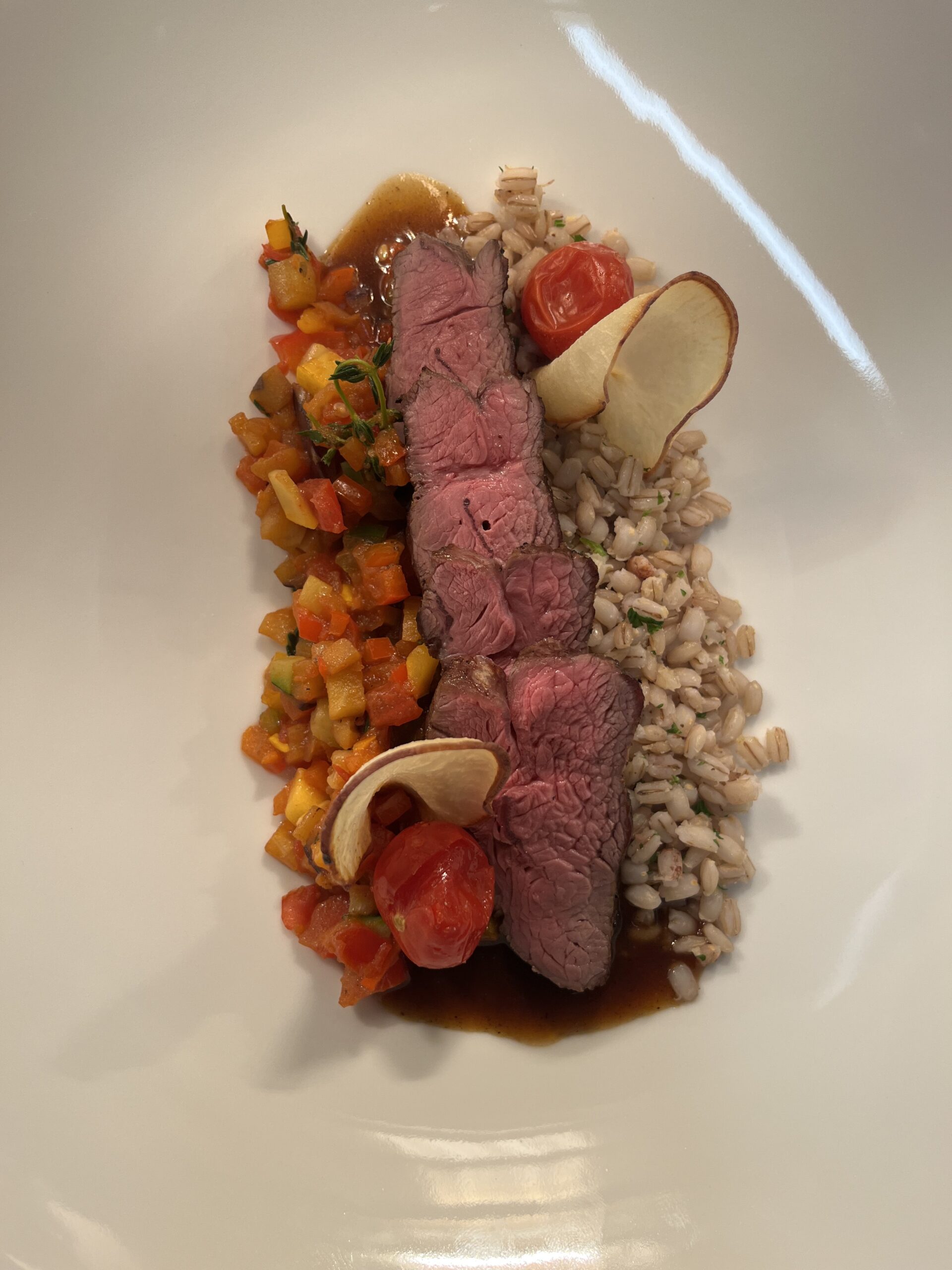 - Beilage: Rosmarinjus, Ratatouille-Essenz, Auberginenpüree.