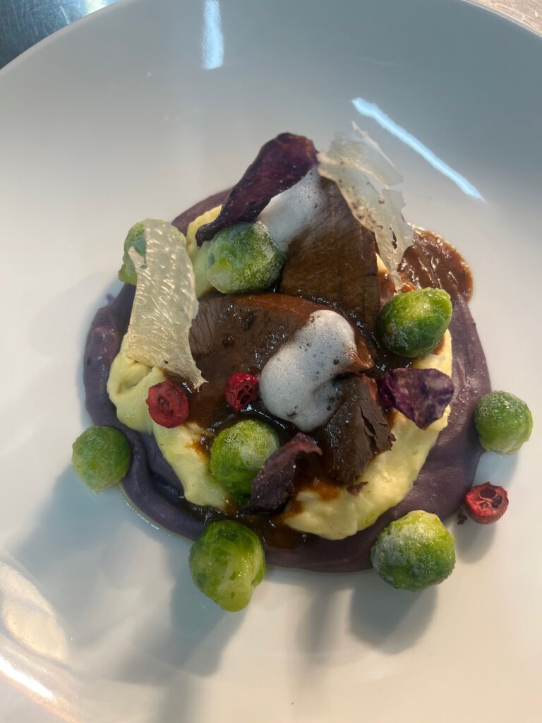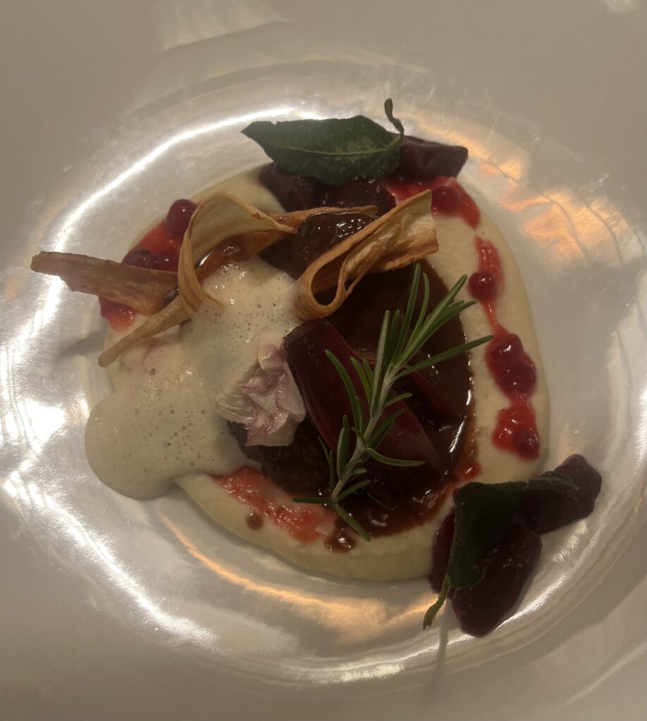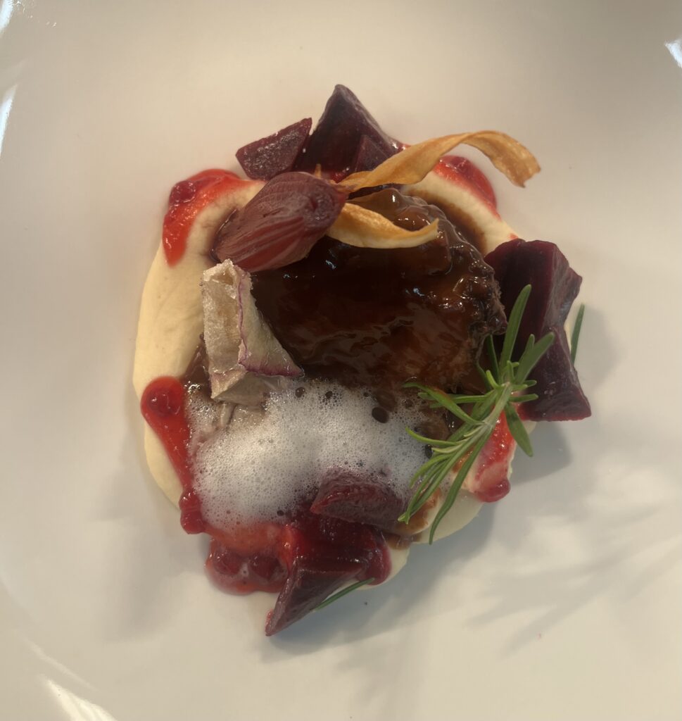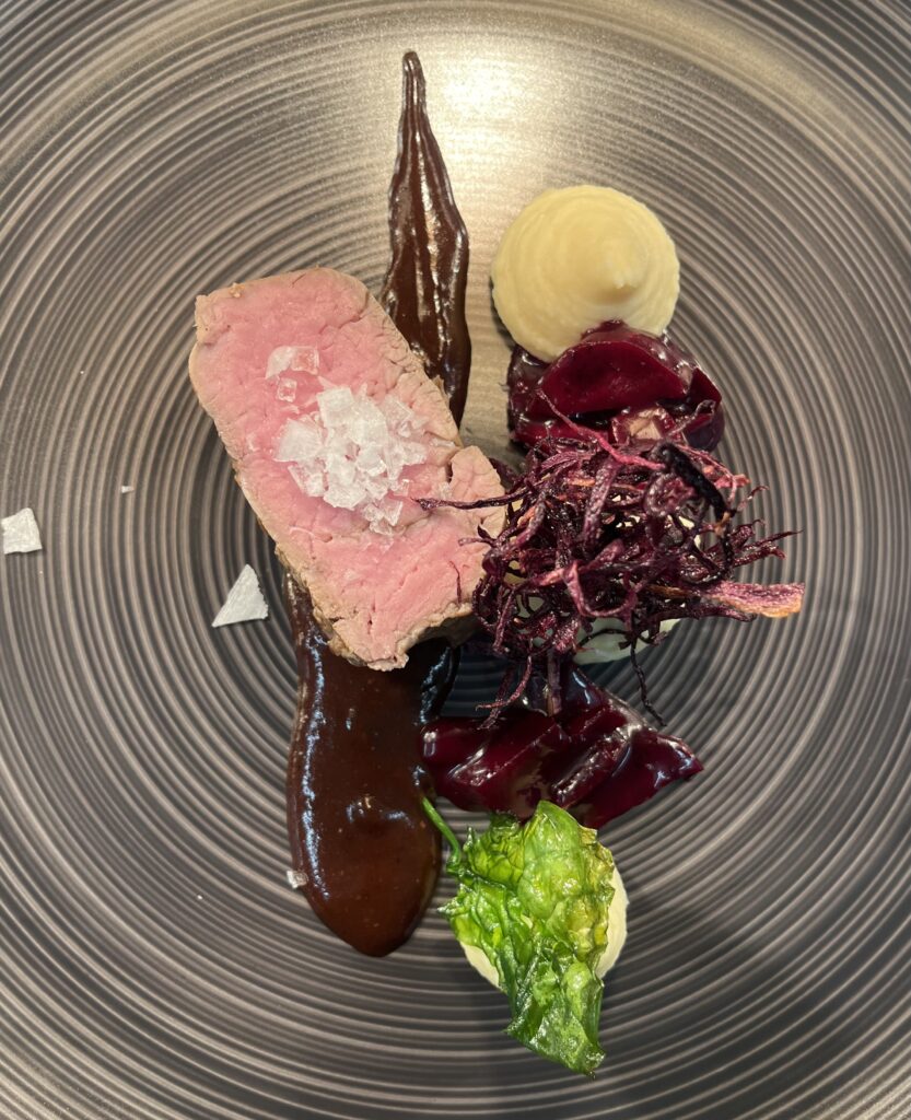 - Beilage: Rote Bete als Carpaccio, Püree und Chips, Jus mit Kakao.