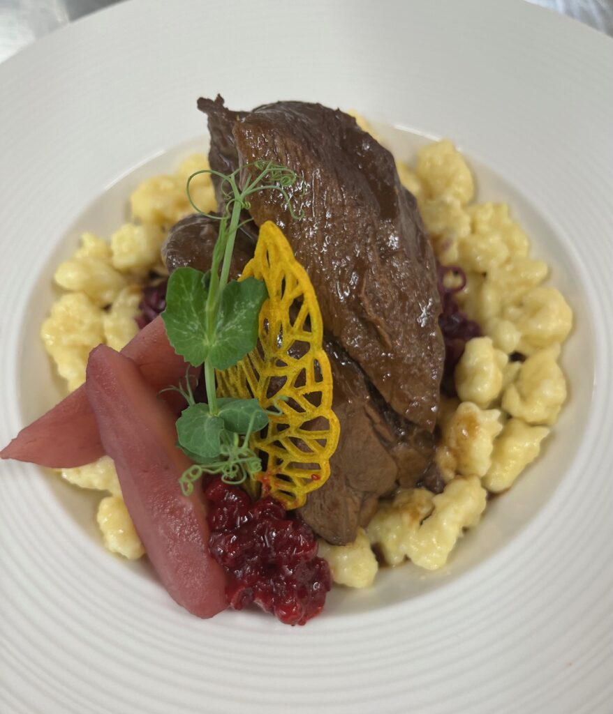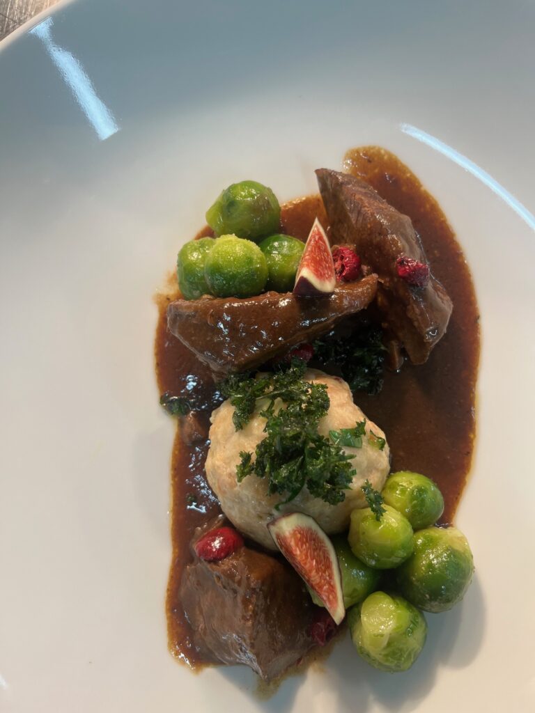 - Beilage: Rotkohlvariation (klassisch, Gel, Chips), Kartoffelknödel.