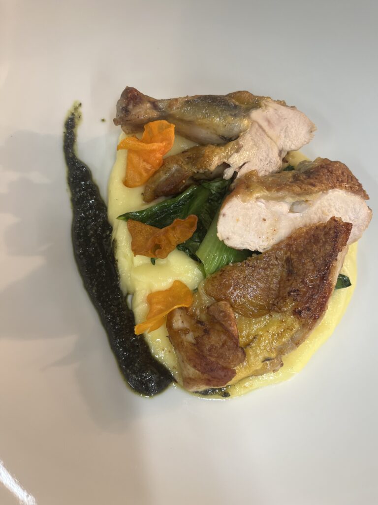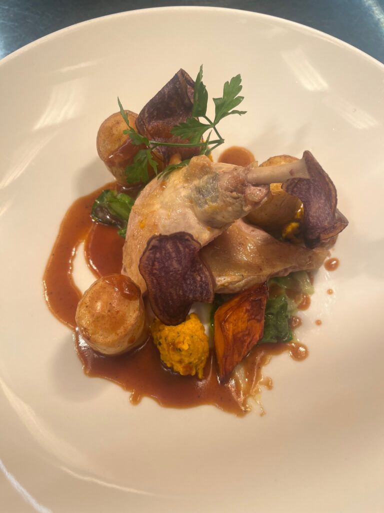 - Technik: Brust kurz gebraten, Keule confiert.