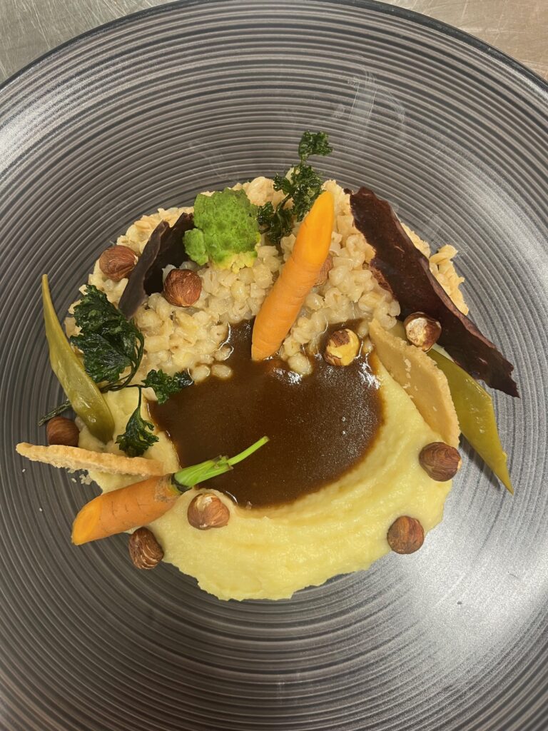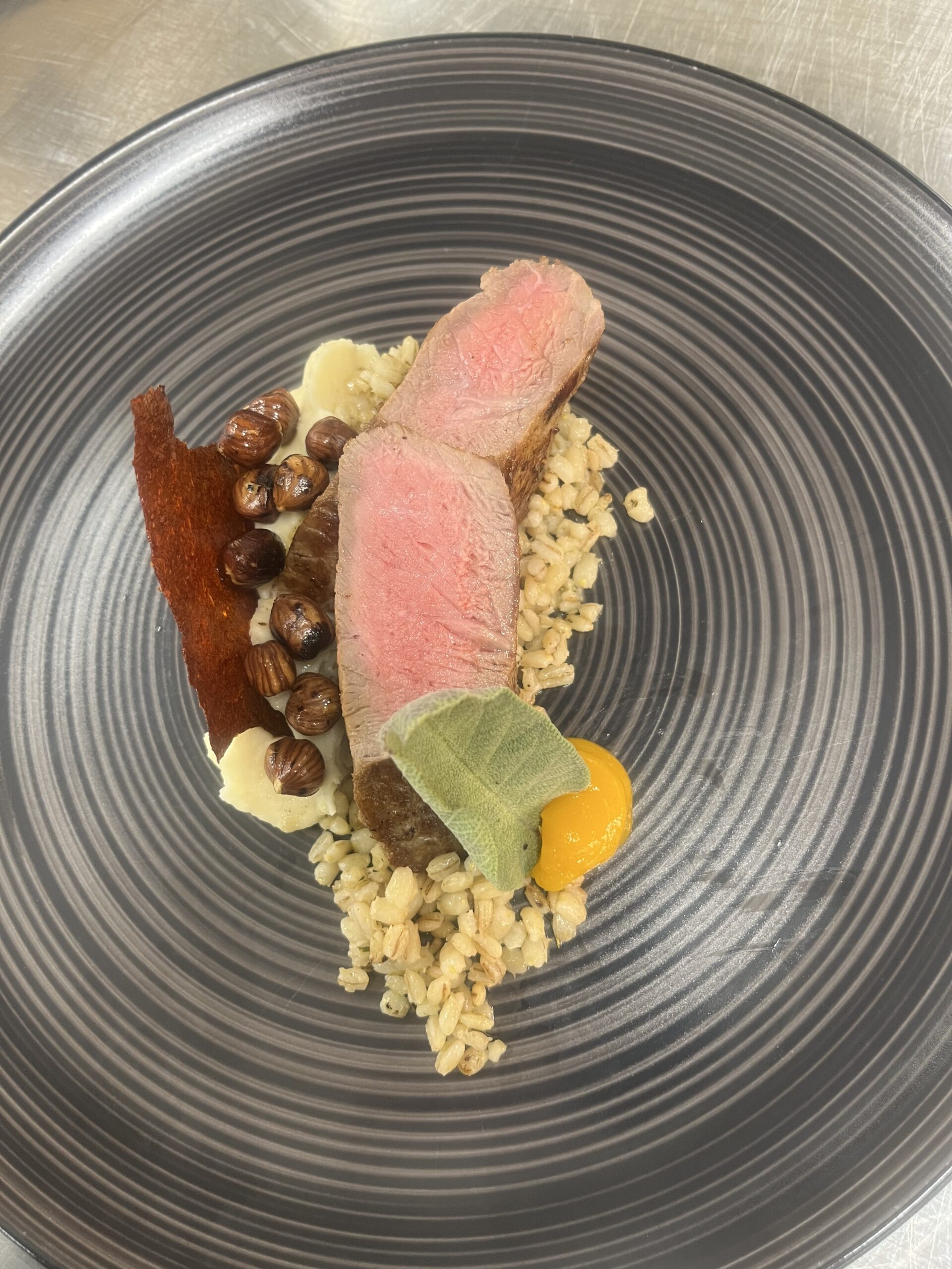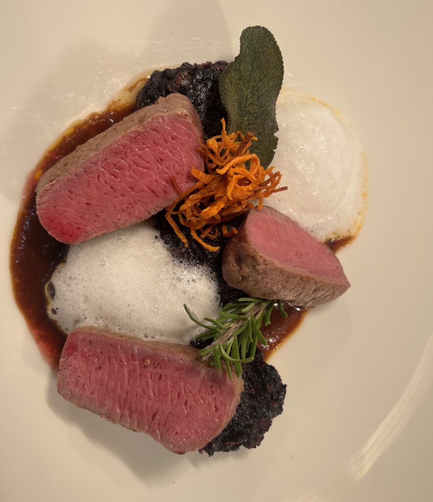 - Technik: Carré bei 56 °C sous-vide, danach kurz in Nussbutter gebraten.