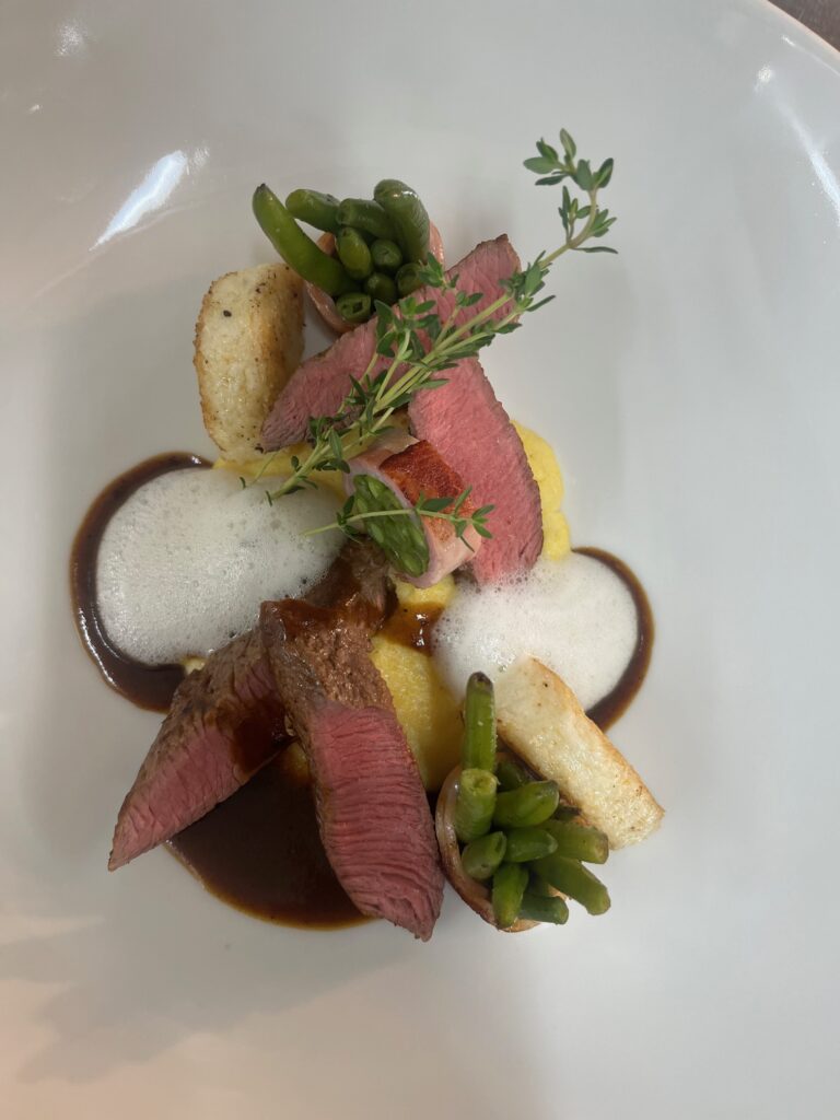- Technik: Brust rosa gebraten, Jus mit Cassis reduziert.
