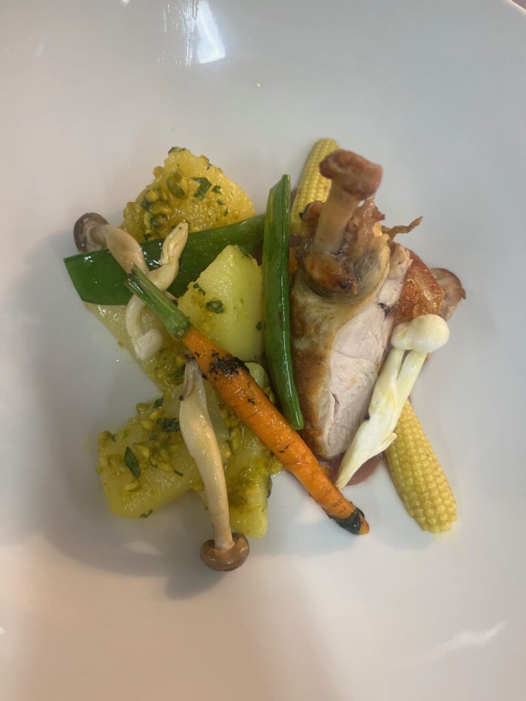 - Technik: Brust kurz gebraten, Keulen confiert.