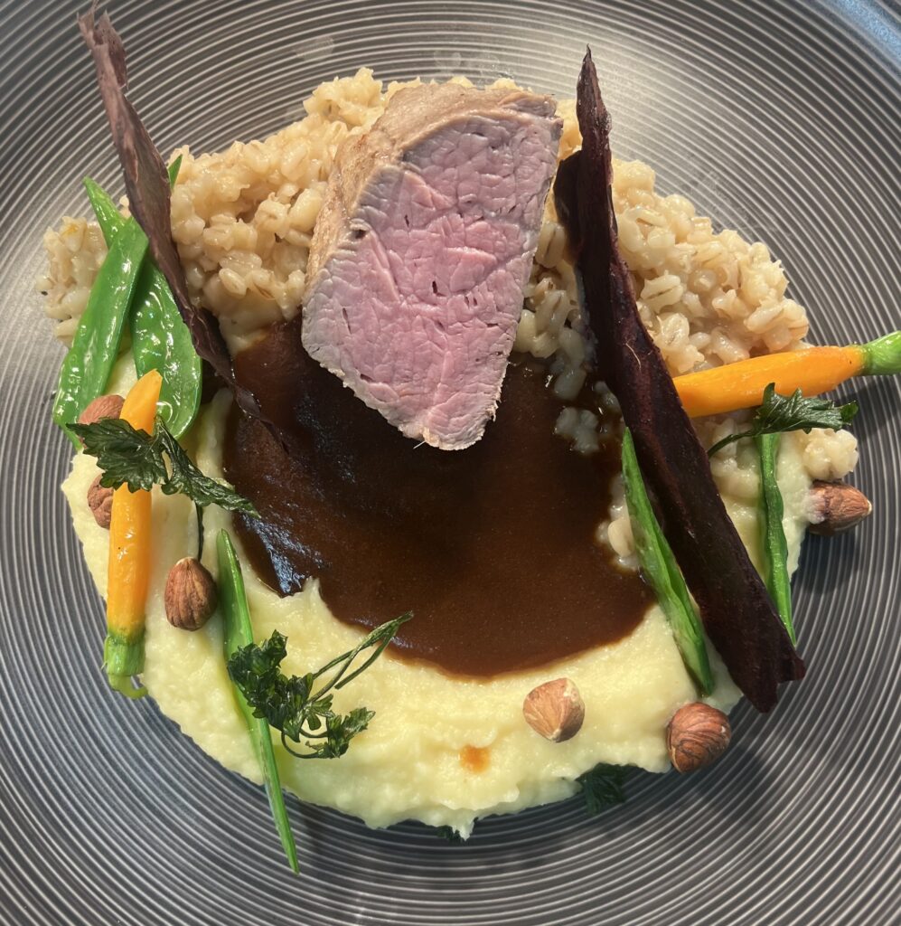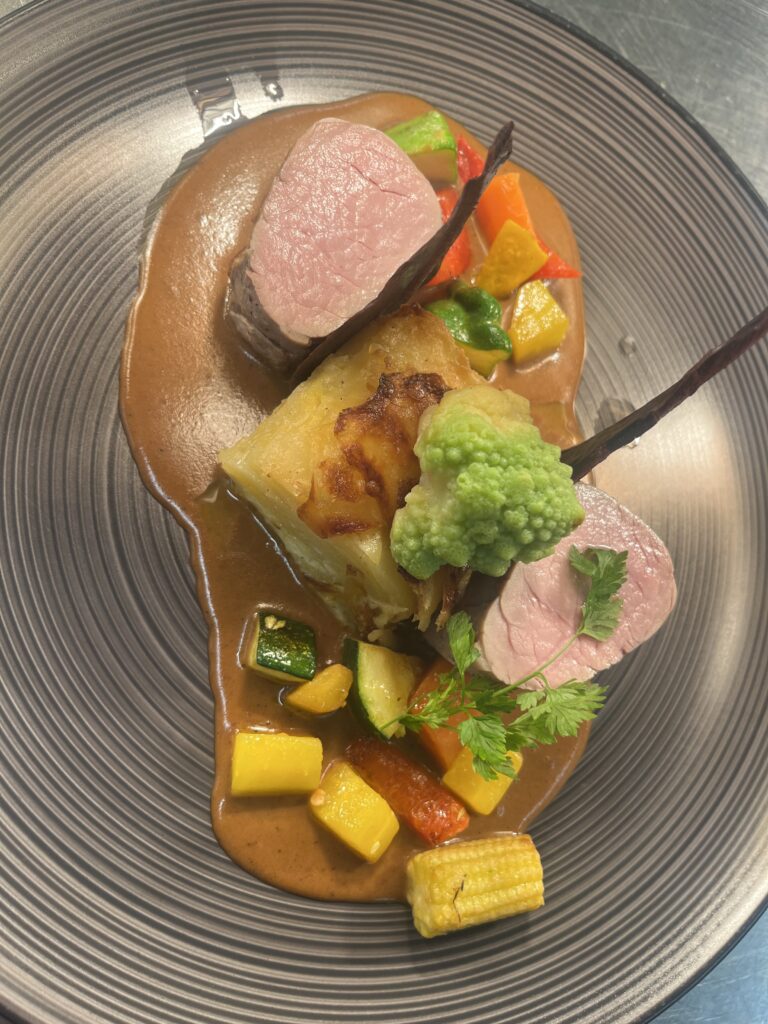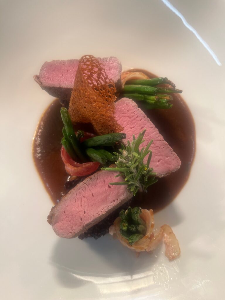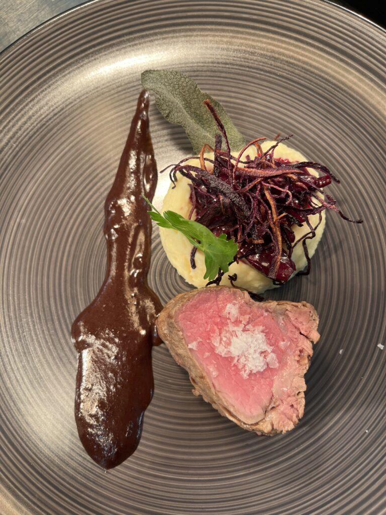- Technik: Filet rosa gegart, Sauce mit Rotwein und Bitterschokolade.