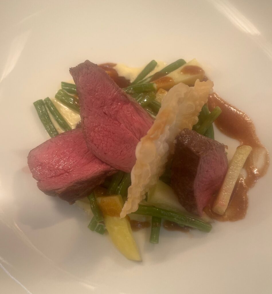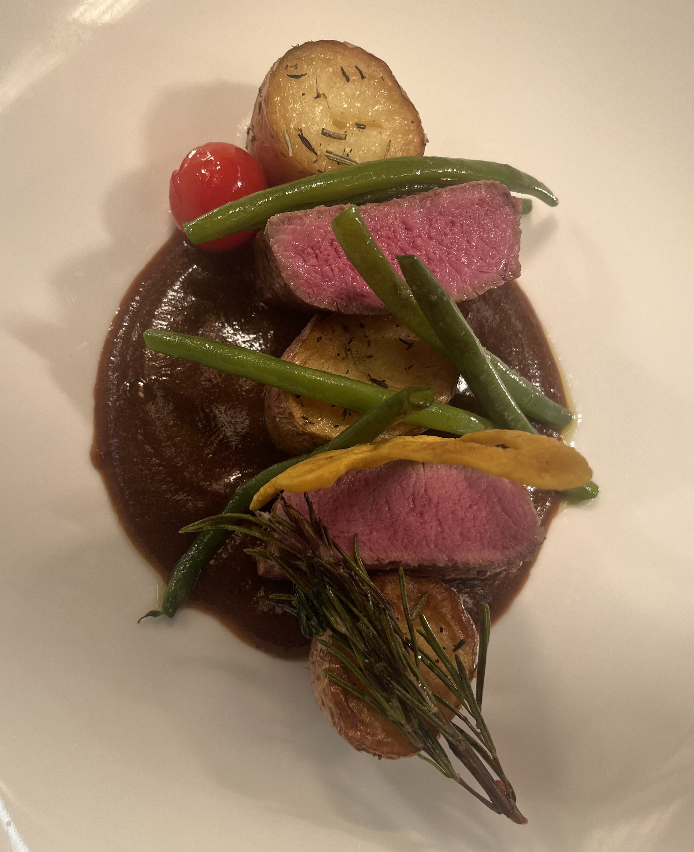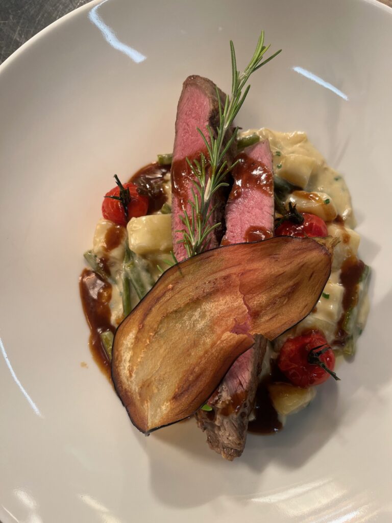 - Technik: Filet rosa gegart, Sauce mit Rotwein und Bitterschokolade.