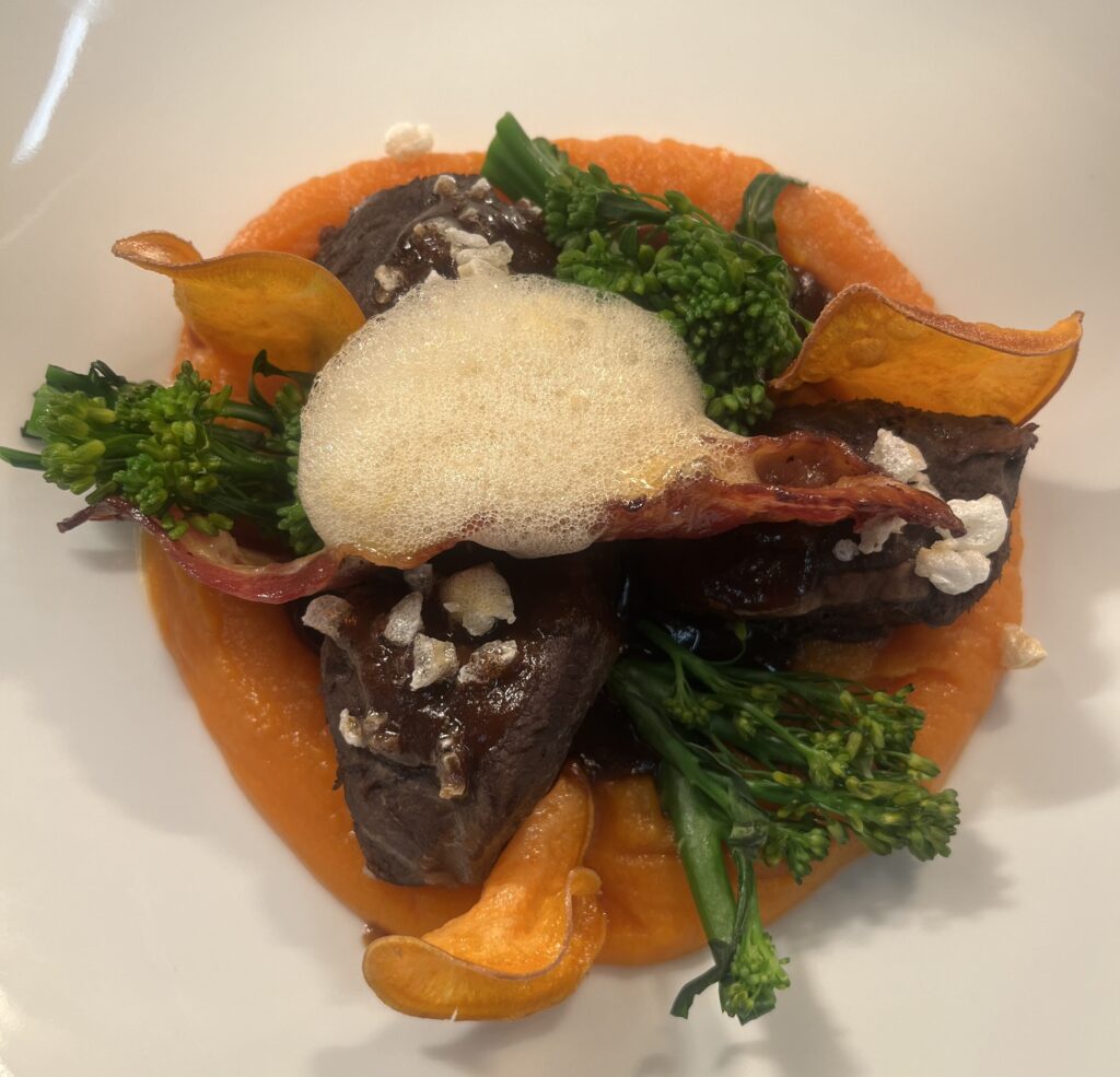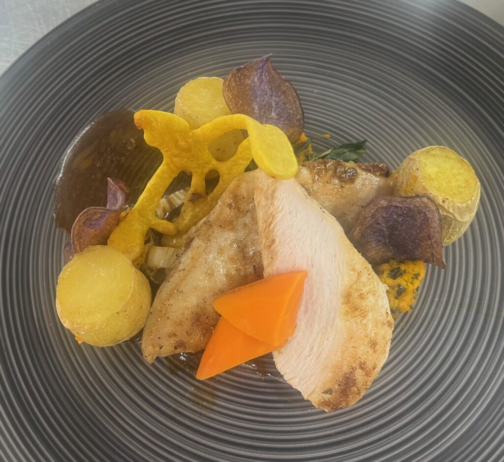 - Beilage: Estragonschaum, Karottenpüree, confierte Mini-Karotten.