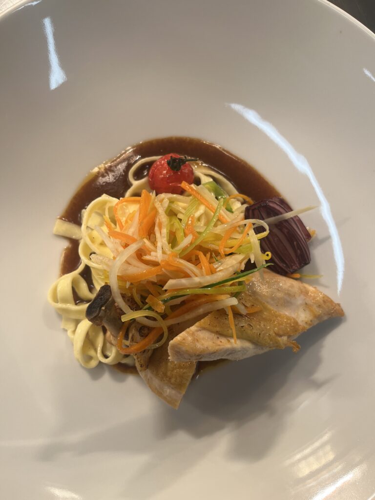 - Technik: Brust kurz gebraten, Keule confiert, Kaffeejus reduziert.