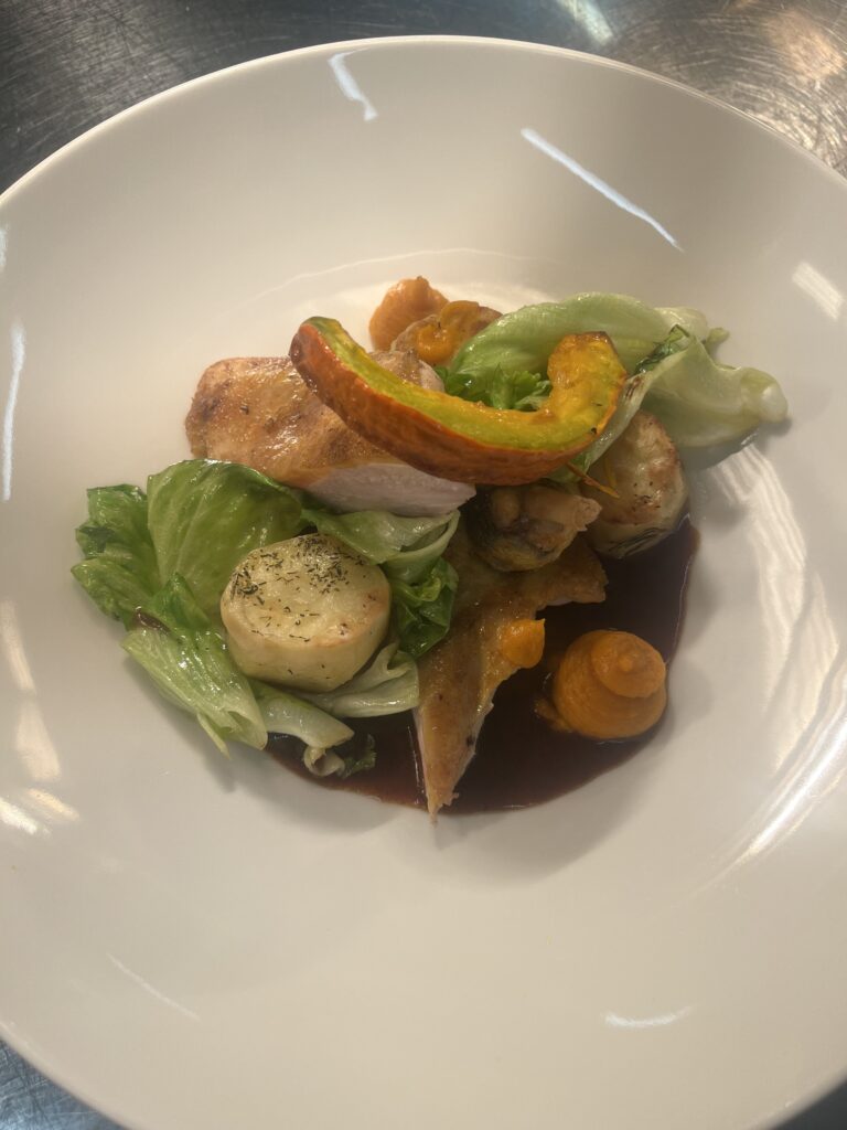 - Technik: Suprême vom Perlhuhn gefüllt, sous-vide gegart und glasiert.