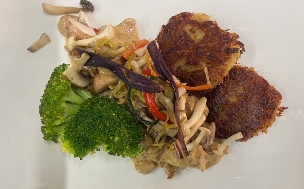- Beilage: Lauchpüree, Senfjus, gebratene Pilze.