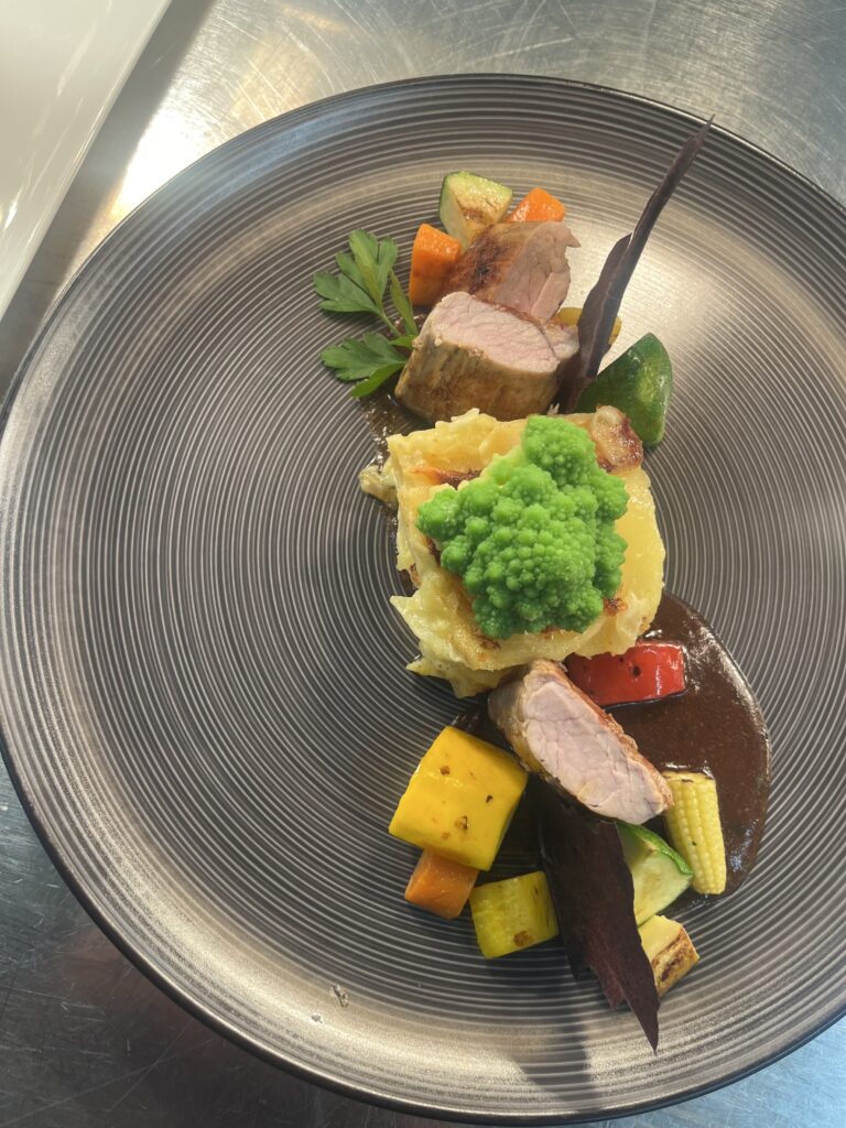 - Beilage: Kartoffelgratin, Babyspinat, Madeira-Jus.