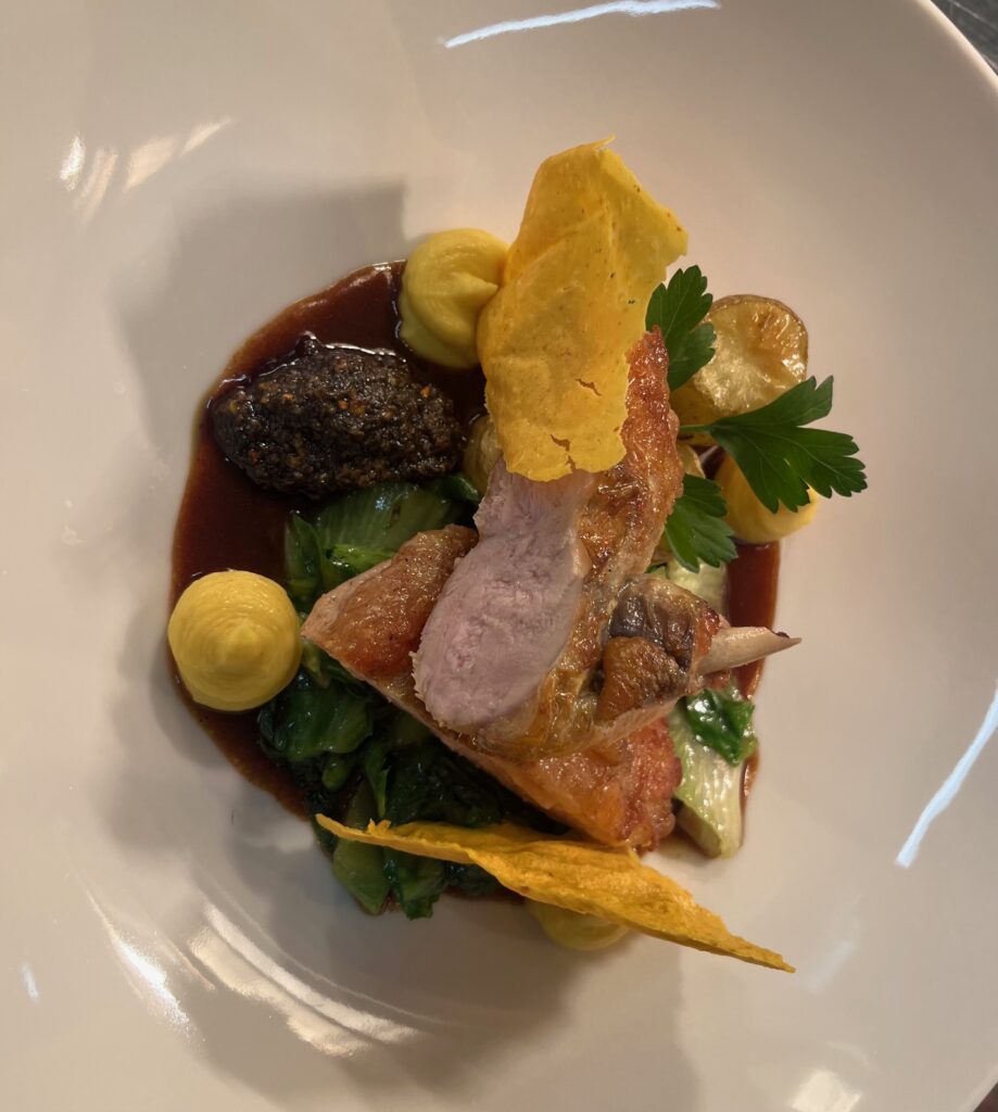 - Technik: Entenbrust rosa gebraten, Haut knusprig ausgelassen.