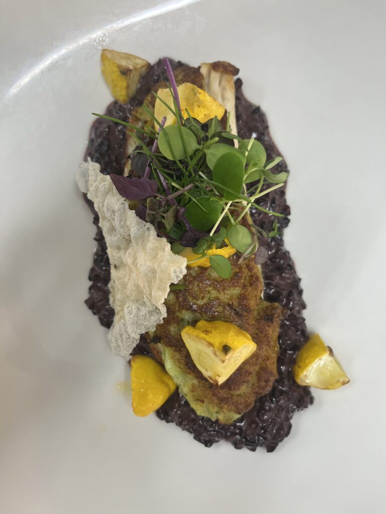 - Präsentation: Püree als Basis, Jakobsmuscheln darauf, Microgreens als Akzent