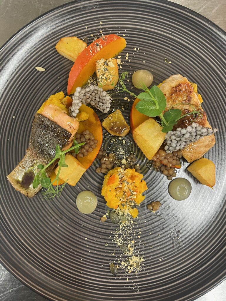 Wolfsbarschfilet auf Kürbis-Kokos-Püree