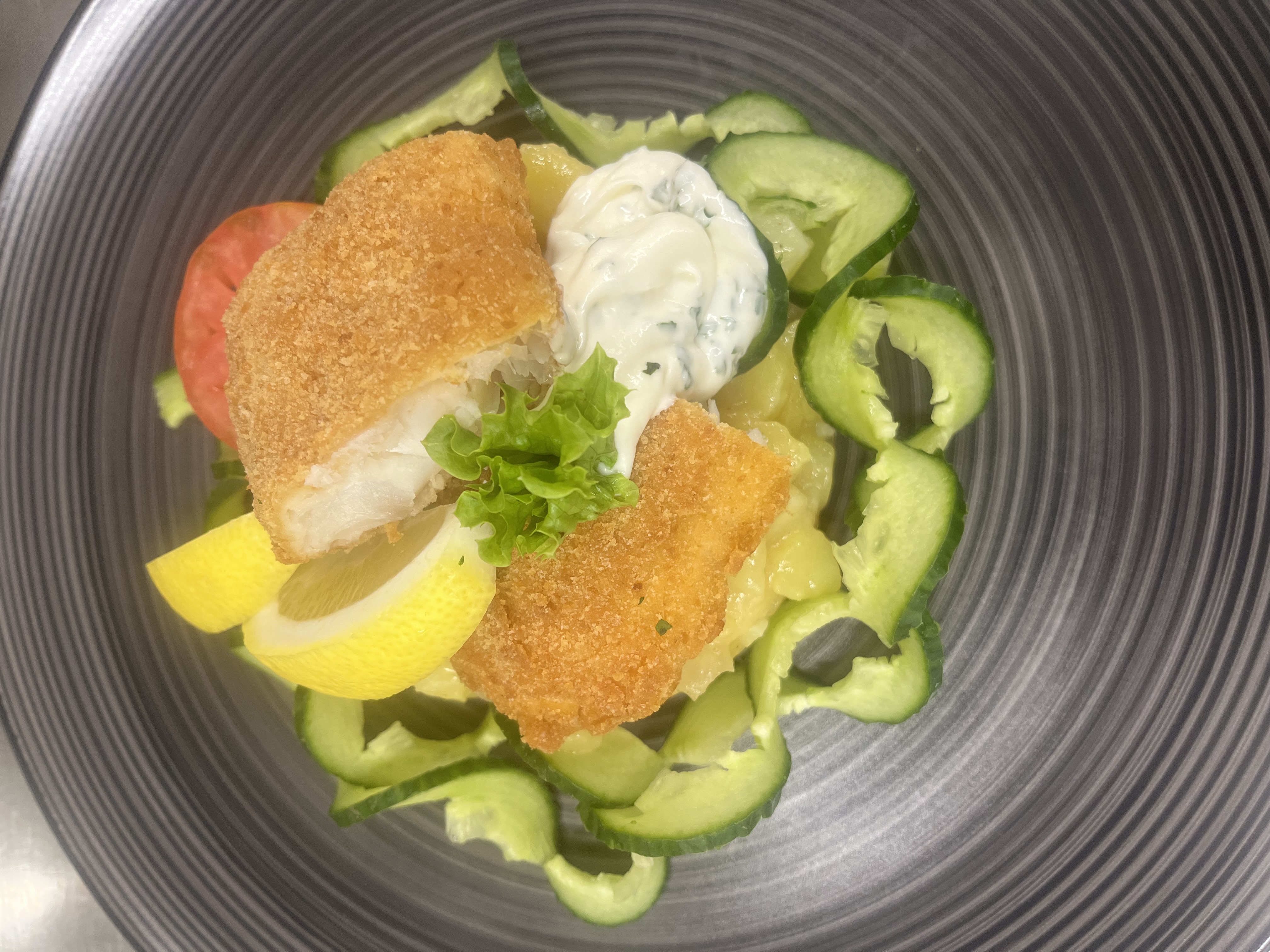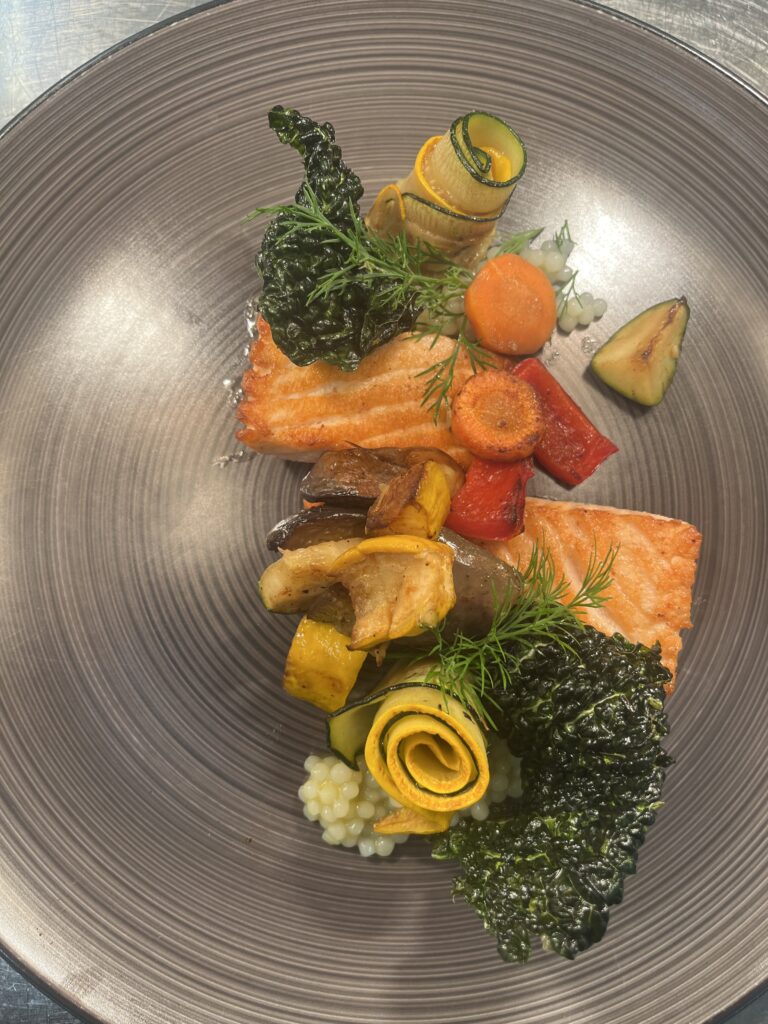 - Präsentation: Fisch mittig, Gemüse dekorativ