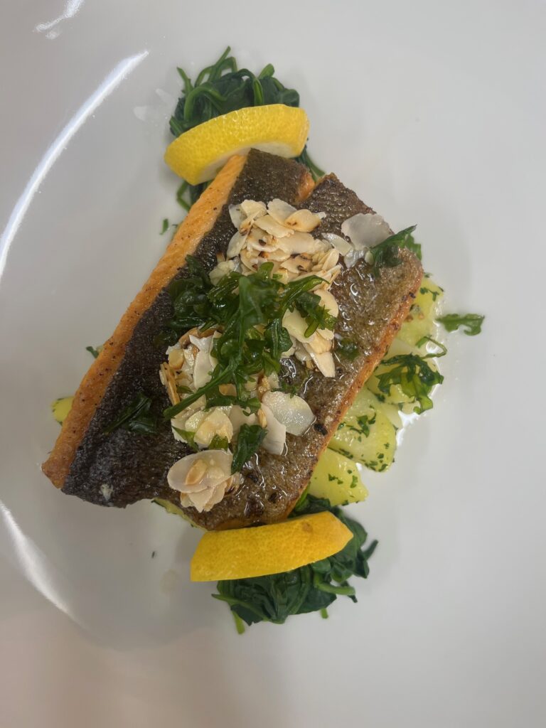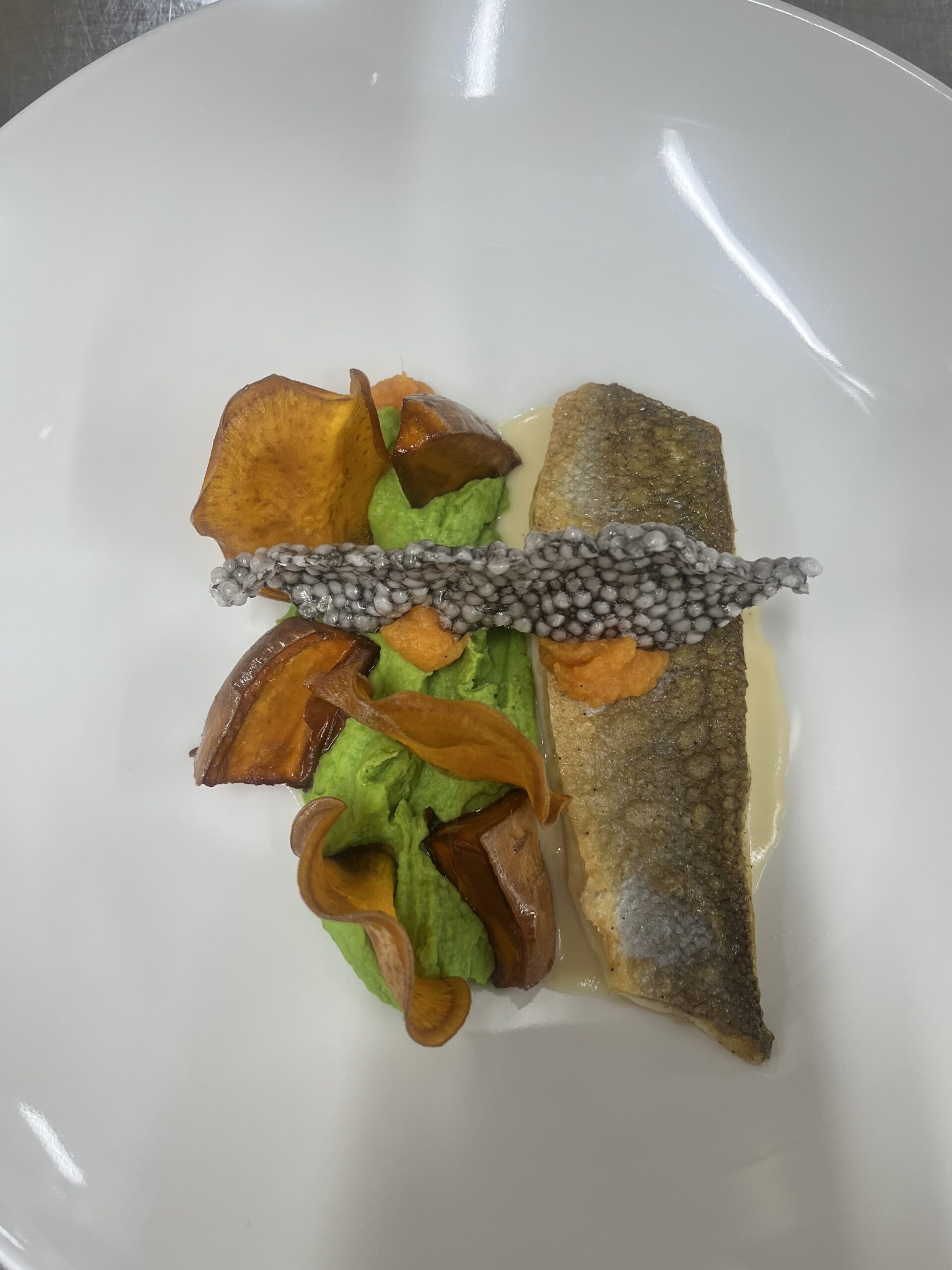 - Präsentation: Fisch leicht schräg auf Püree, Microgreens als Akzent