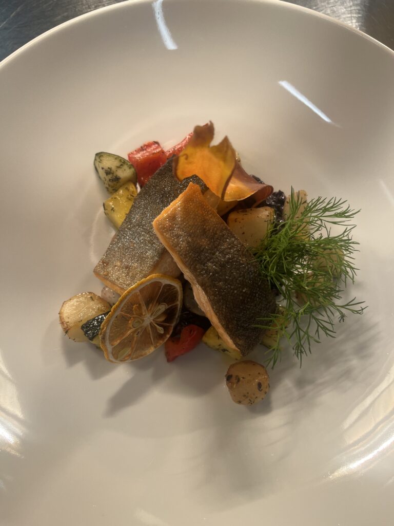 - Präsentation: Makrele schräg auf Gemüse, Sauce punktuell