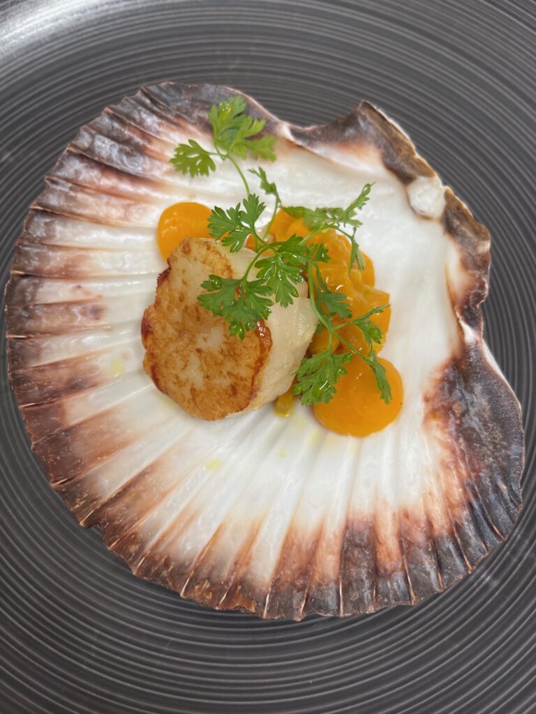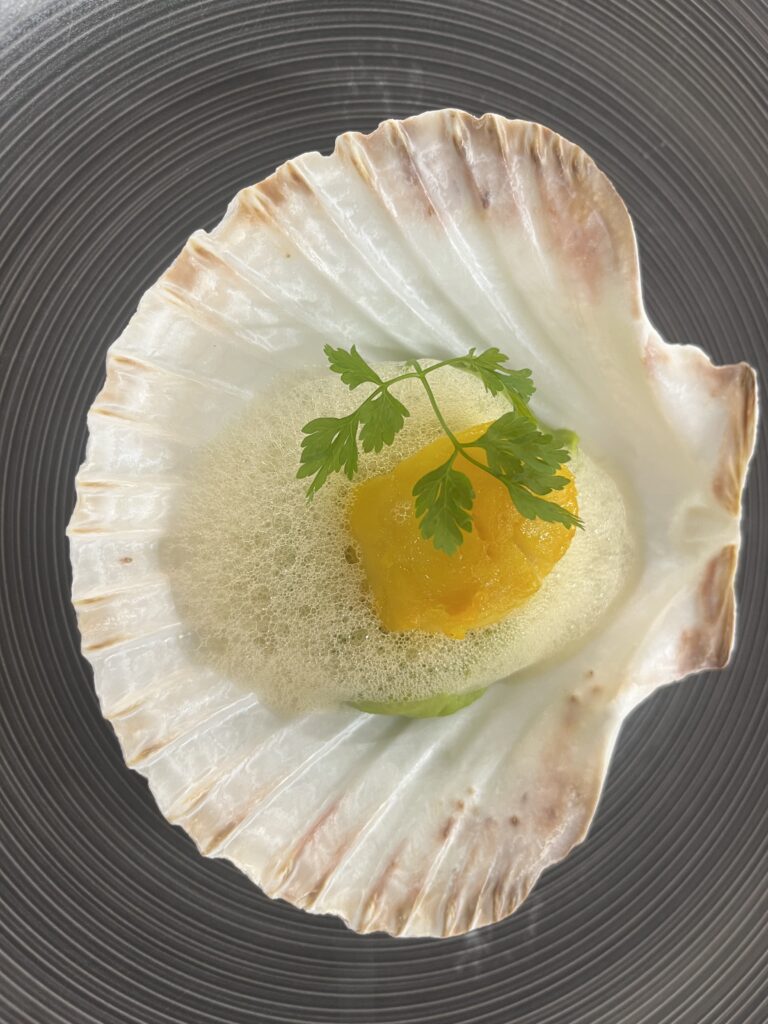 Kurz gebratene Muschel auf samtigem Püree, mit Curry-Emulsion.