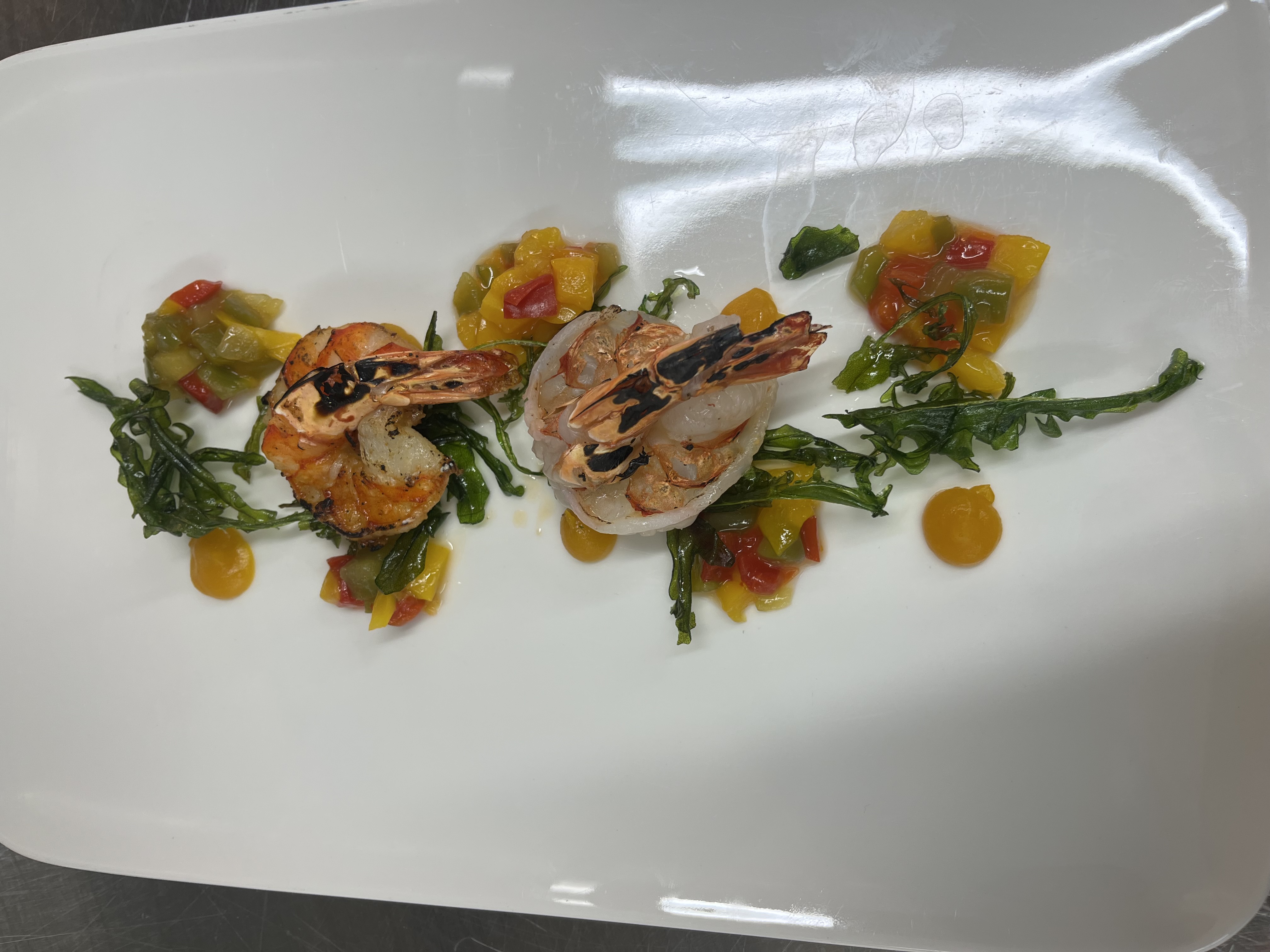 Aufgeschäumt im Olivenöl gegart, mit Paprikapüree.