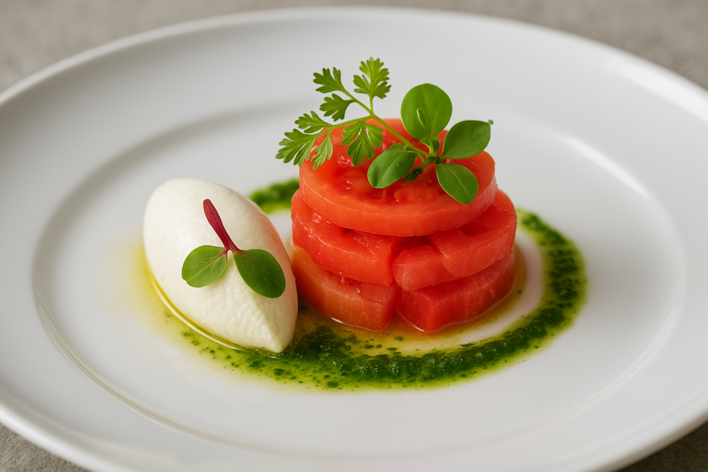Tomatenwasser klären, mit Agar anziehen lassen. Würfeln. Mit Basilikumöl beträufeln.