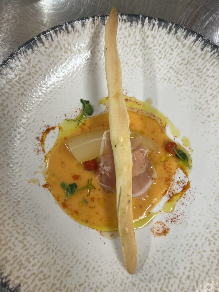Kabeljau confieren, auskühlen, mit Olivenöl servieren.