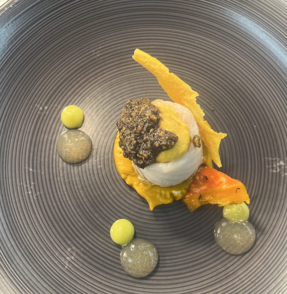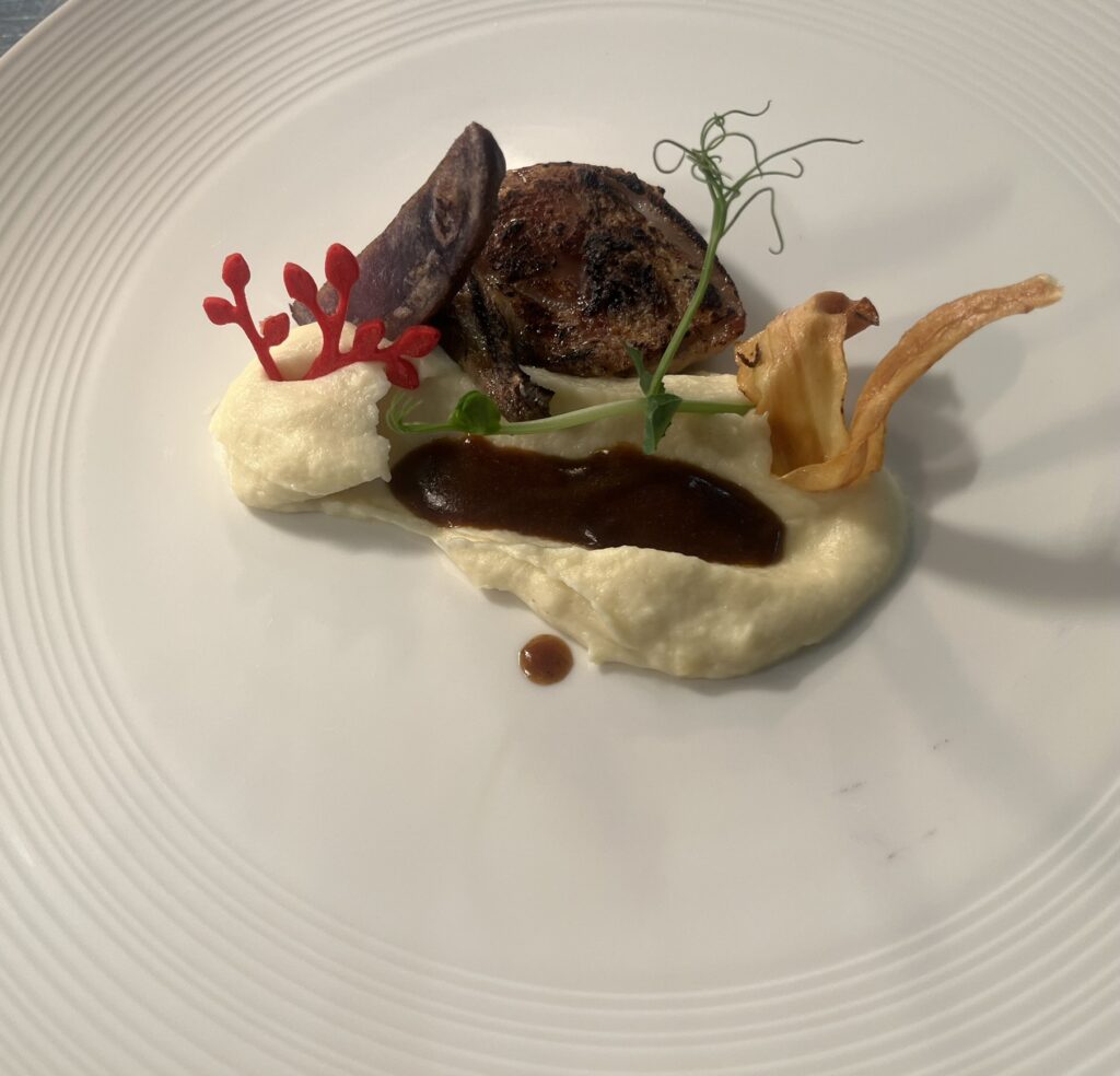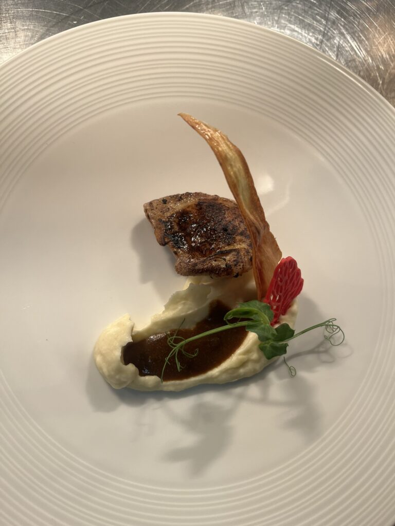 - Wildente confiert auf Kürbiscreme – Beilage: Kartoffelgratin, Zuckerschoten
