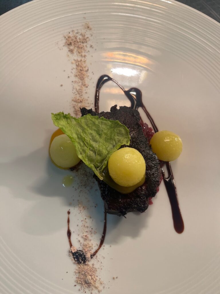 - Taubenbrust auf Rotweinreduktion – Beilage: Kartoffelgratin, Zuckerschoten