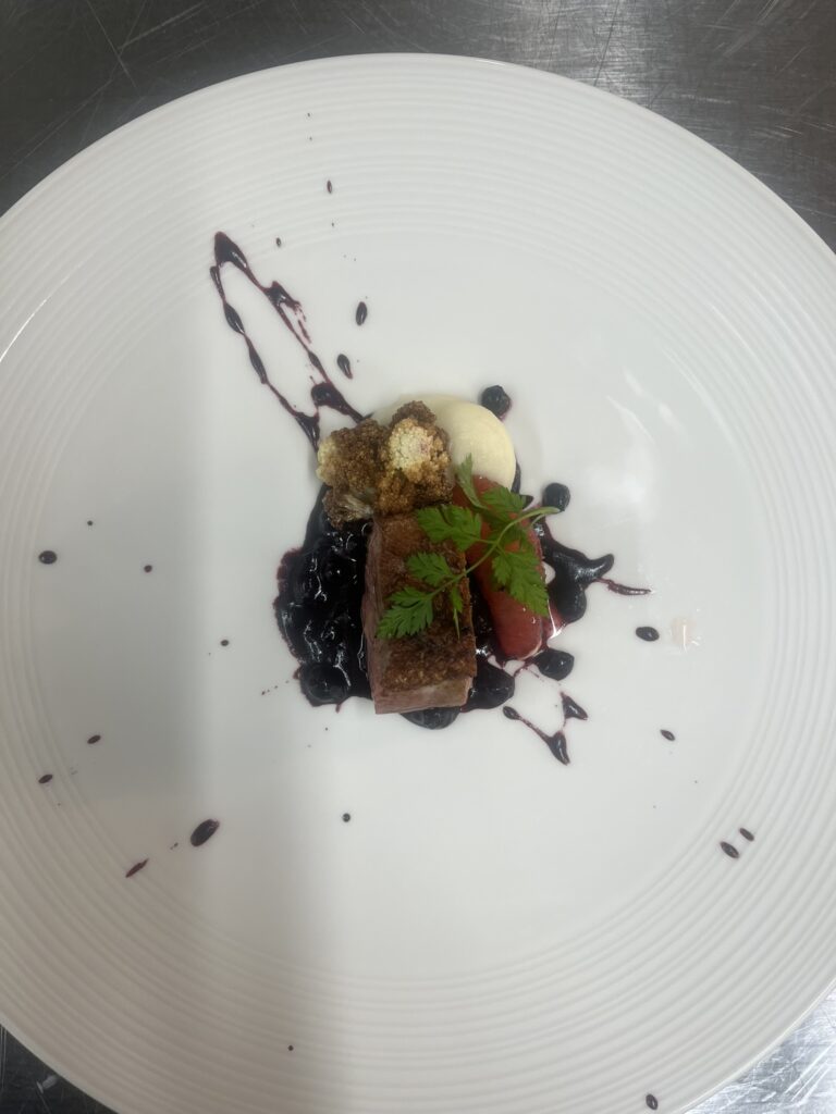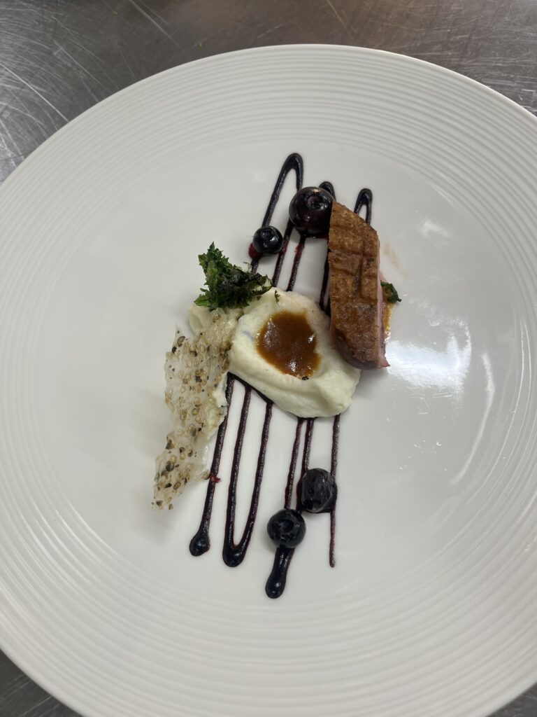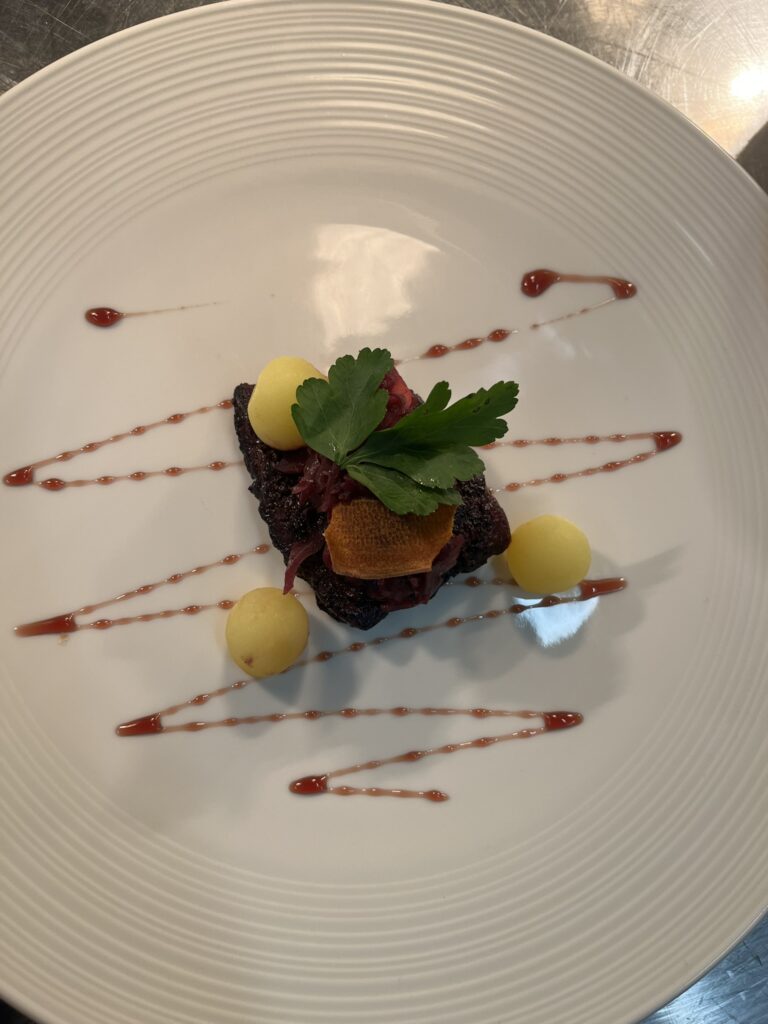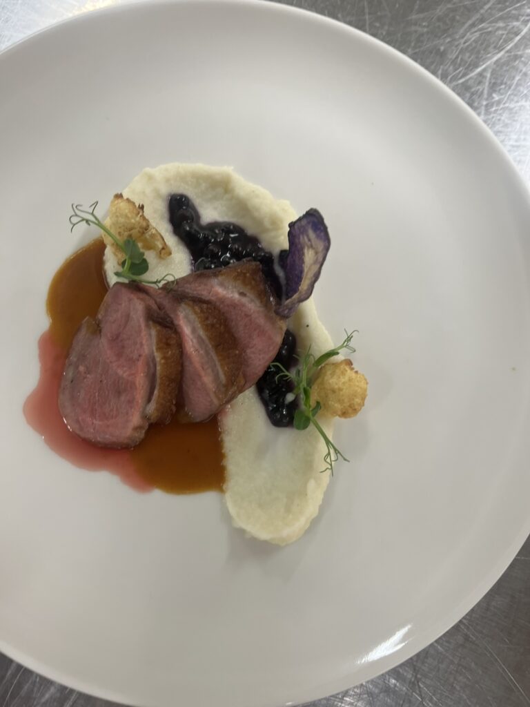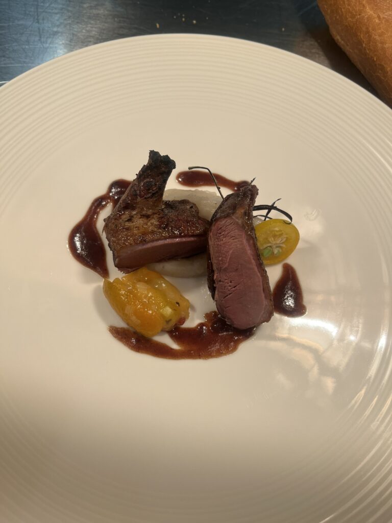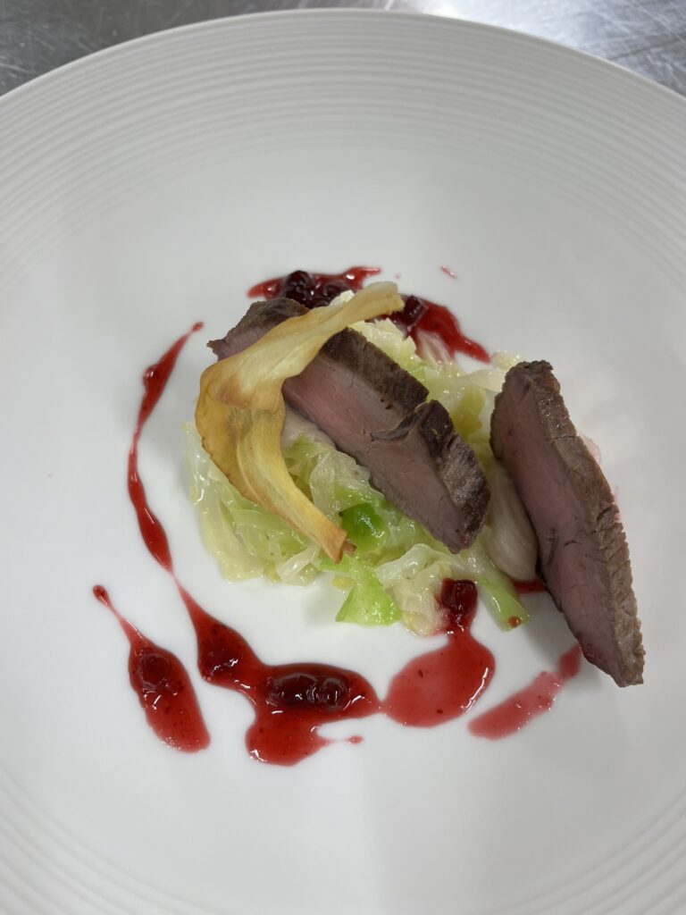 - Entenbrust auf Kirschreduktion – Beilage: Kartoffelgratin, glasiertes Gemüse