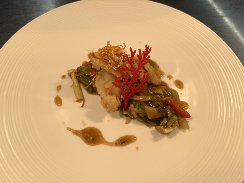 - Poulardenstreifen in Honig-Chili-Sauce – Beilage: Jasminreis, glasiertes Gemüse