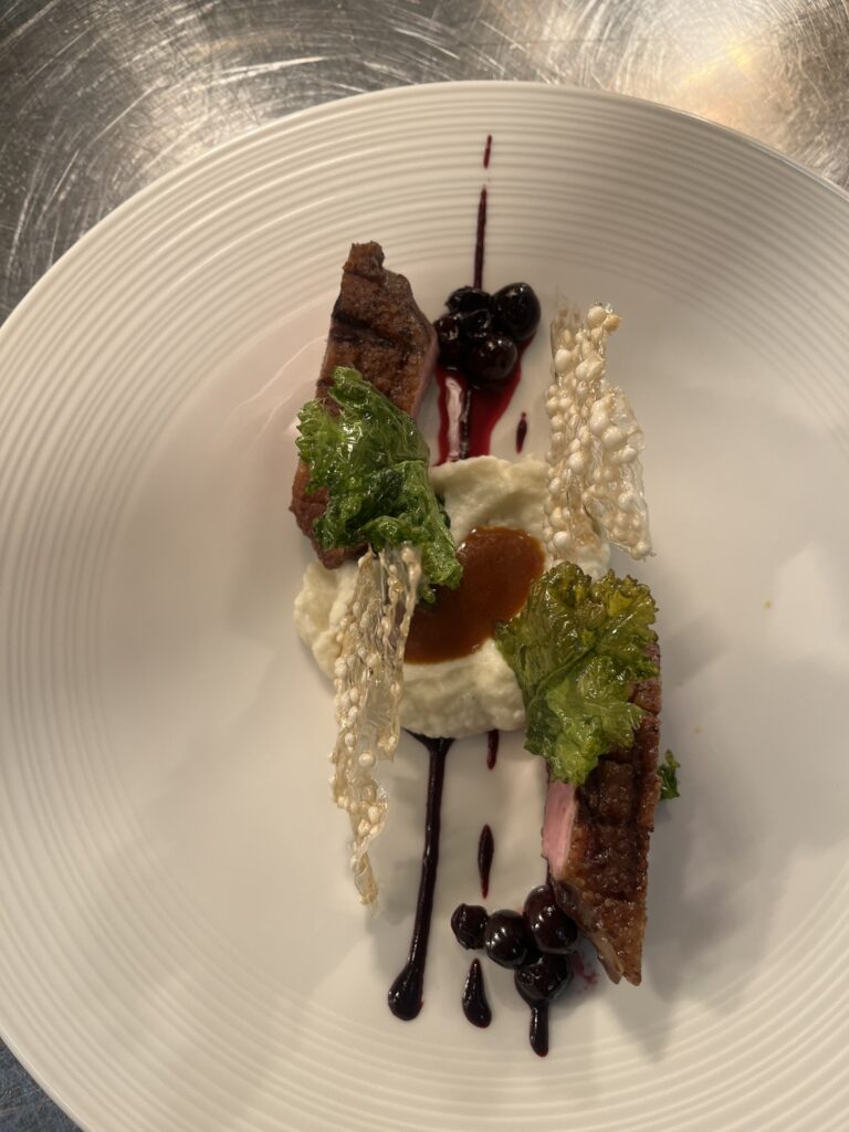 - Wildentenbrust auf Kirschrahm – Beilage: Polenta, Zuckerschoten