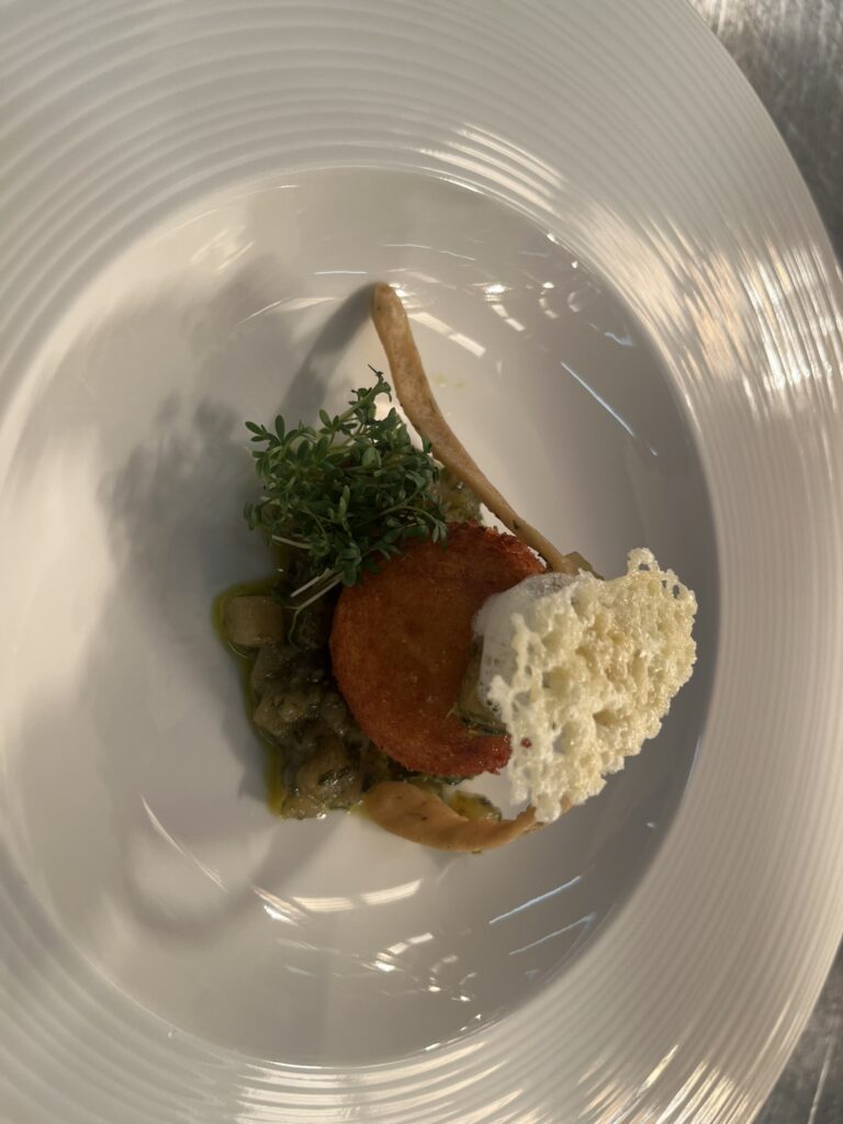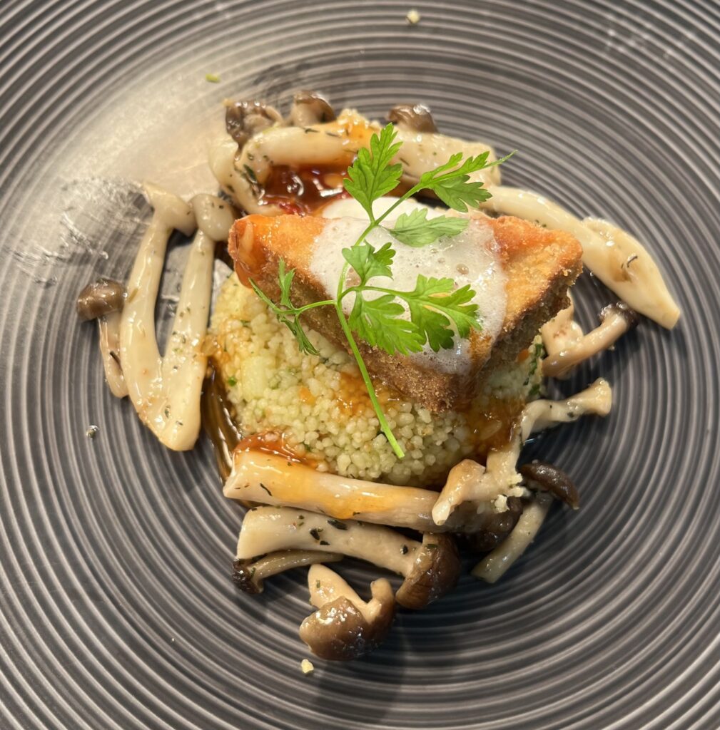 Pilz-Praline auf Kräuterpolenta – Beilage: Polenta, ZuckerschotenRezept: Praline braten, Polenta darunter.