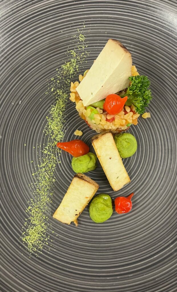 Halloumi-Medaillon auf Kürbis-Ingwer-Creme – Beilage: Polenta, glasiertes GemüseRezept: Medaillon braten, Creme darunter.