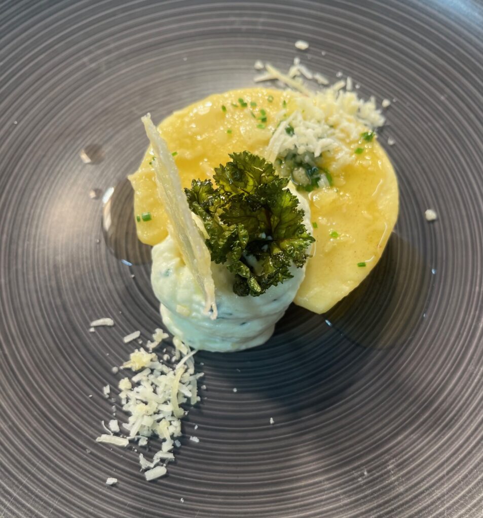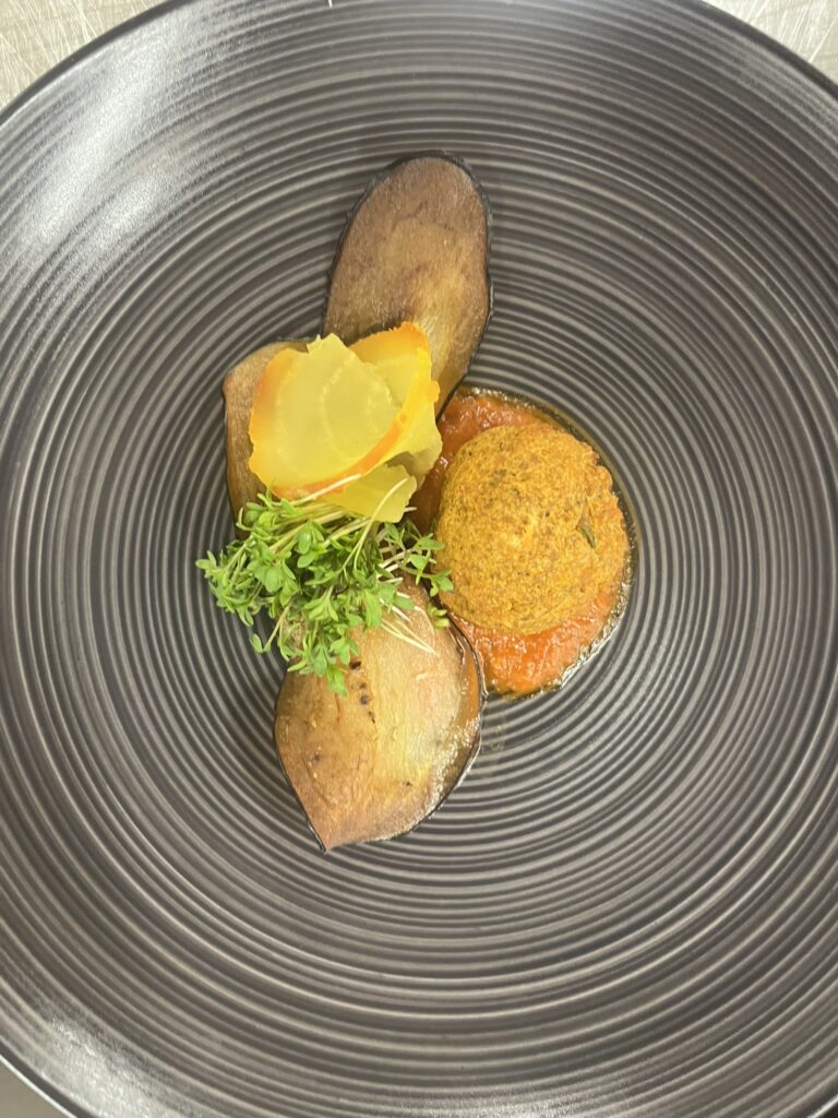 Burrata-Medaillon auf Safran-Karotten-Püree – Beilage: Polenta, glasiertes GemüseRezept: Burrata kurz erwärmen, auf Püree servieren.