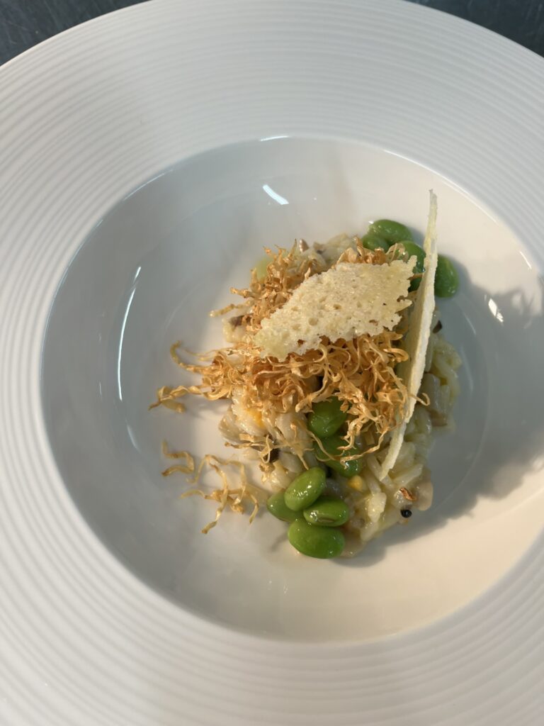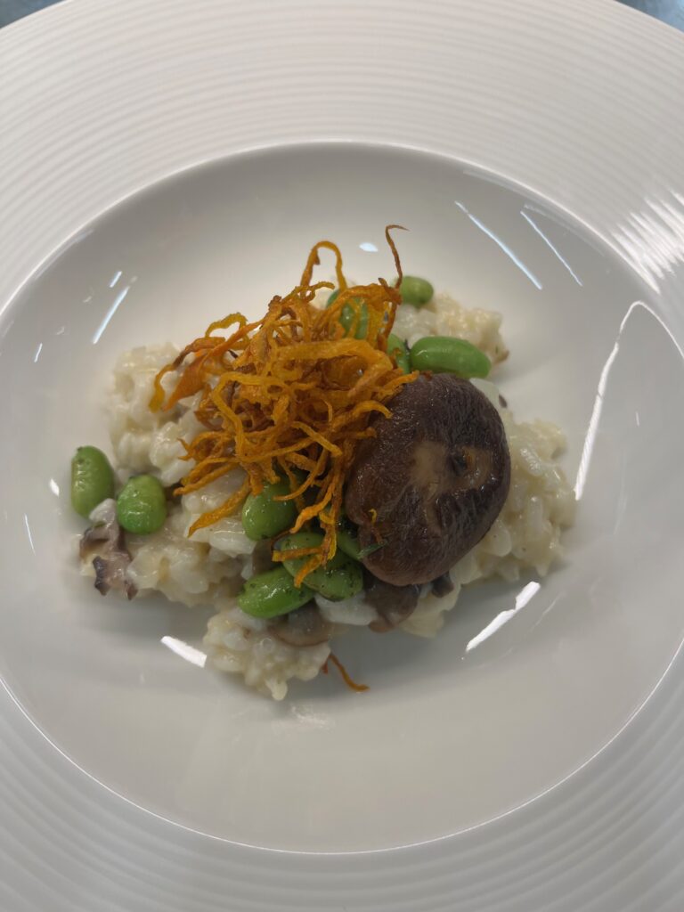 Exotisches Gemüse-Risotto mit Zitronengras – Beilage: Tagliatelle, ZuckerschotenRezept: Risotto kochen, Gemüse und Zitronengras untermischen.