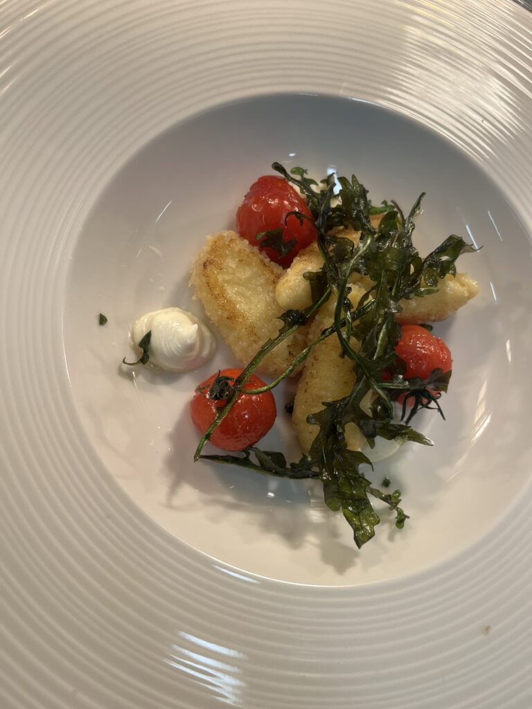 Kürbisgnocchi in Salbeibutter – Beilage: Polenta, glasiertes GemüseRezept: Gnocchi kochen, in Salbeibutter schwenken.