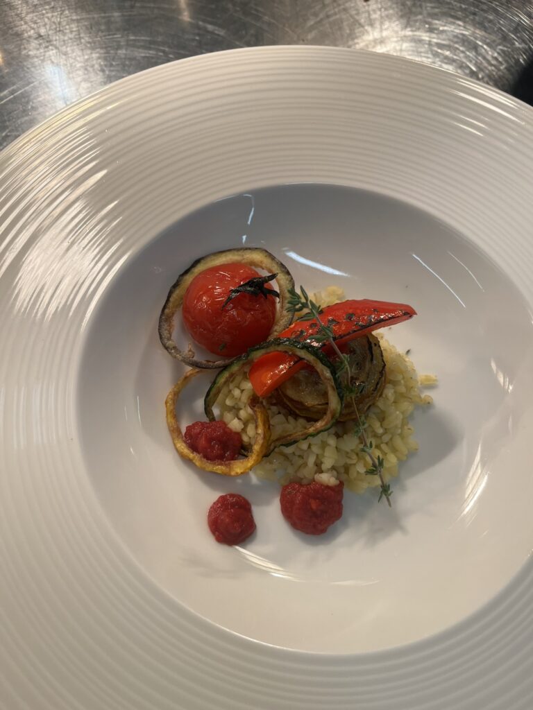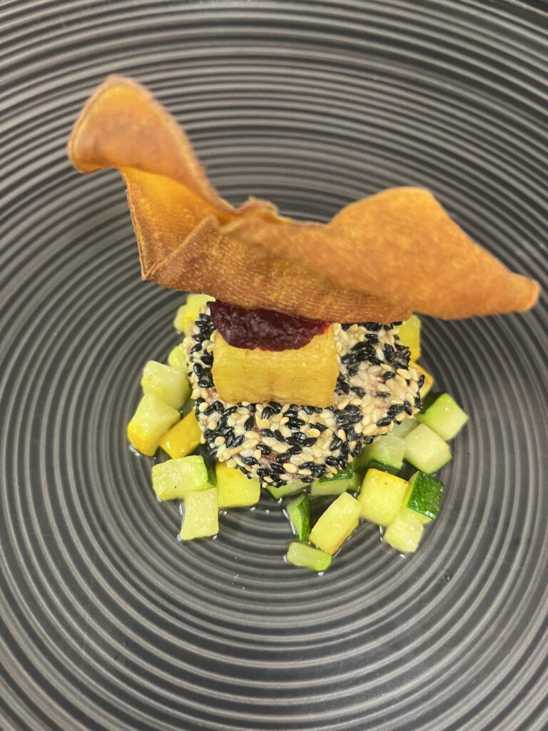 Gegrillte Zucchiniröllchen mit Ricottafüllung – Beilage: Polenta, glasiertes GemüseRezept: Zucchinischeiben grillen, Ricotta einrollen, kurz überbacken.