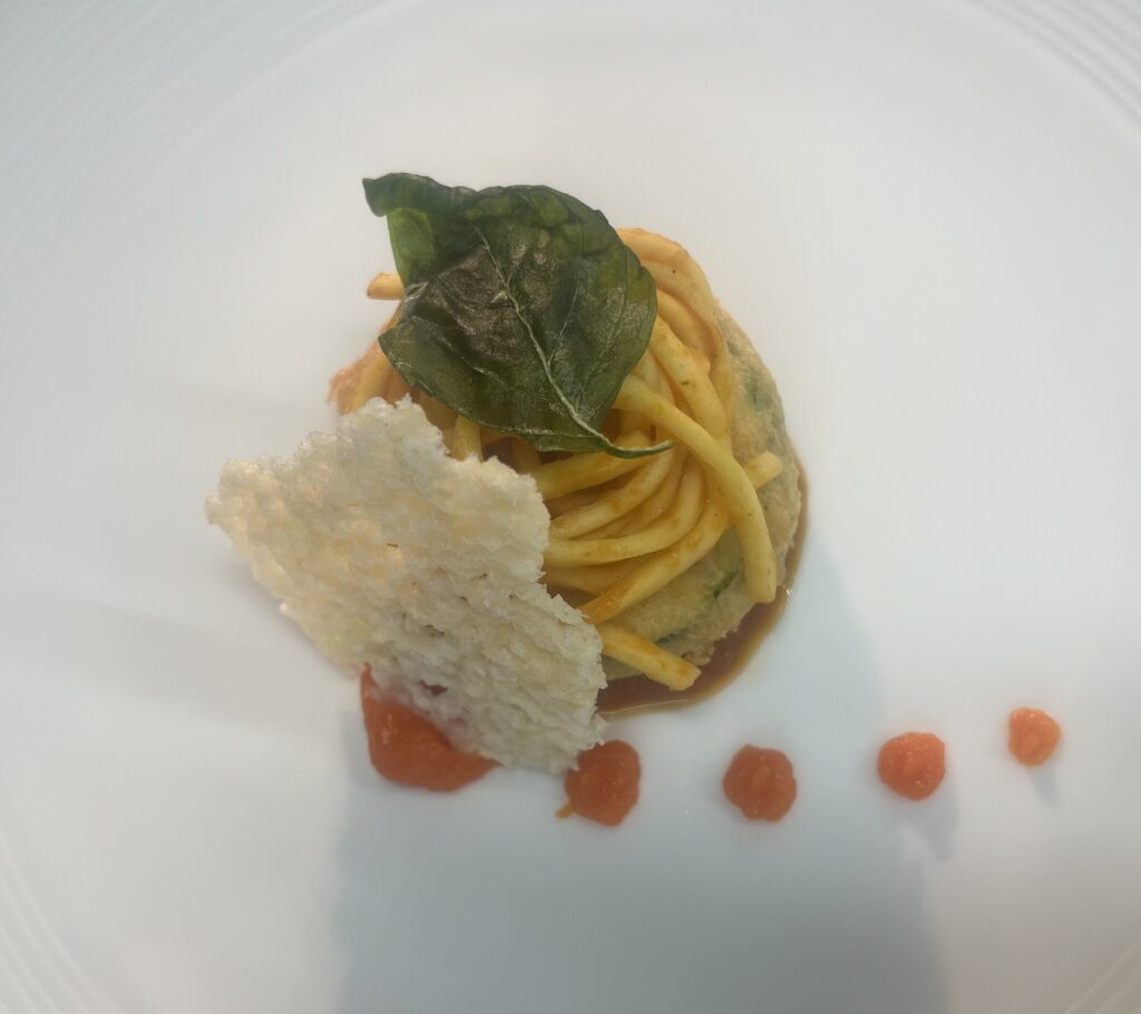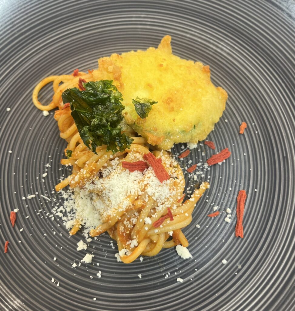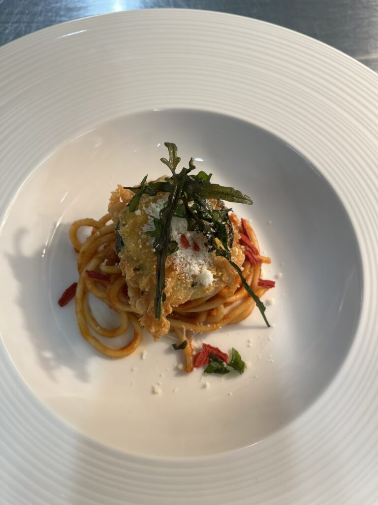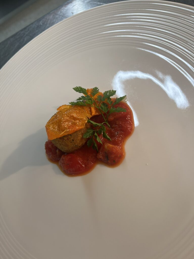 Burrata-Praline in Tomatencreme – Beilage: Tagliatelle, ButterkarottenRezept: Praline braten, Creme darunter.