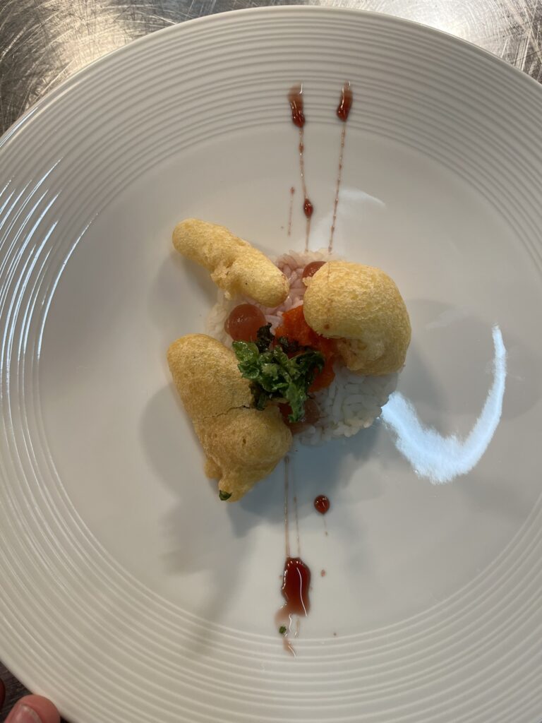 Ricottapralinen in Safransauce – Beilage: Kartoffelgratin, ZuckerschotenRezept: Pralinen braten, Sauce aufziehen.