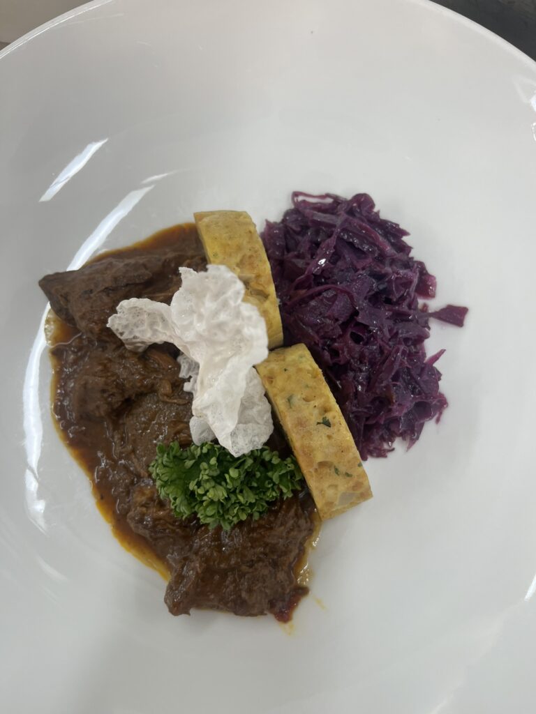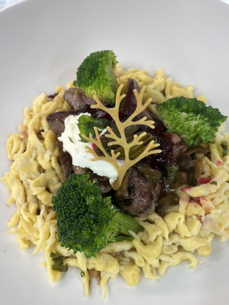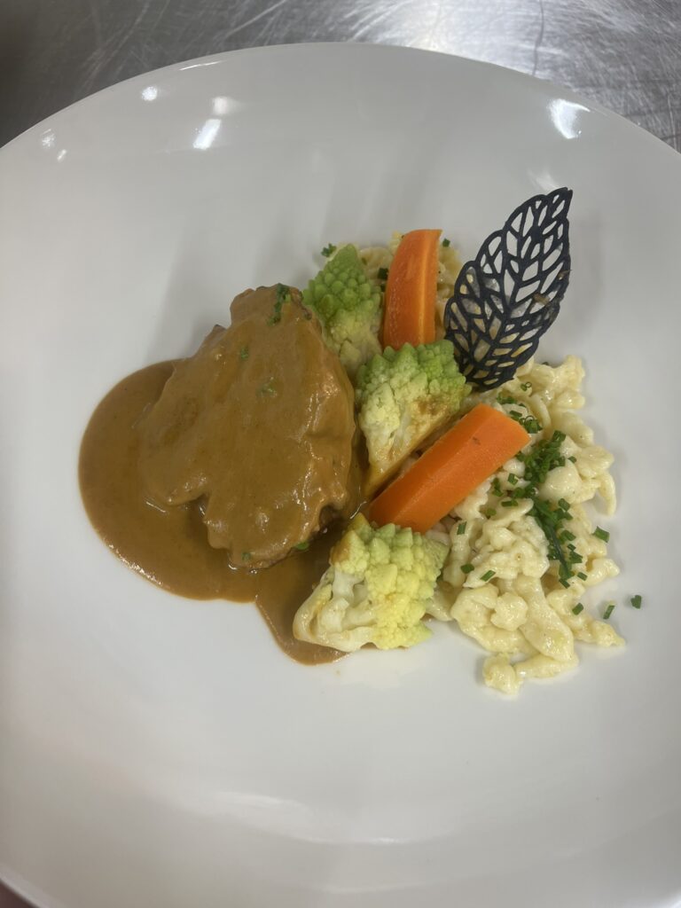- Rindergeschnetzeltes mit Trüffeljus – Beilage: Butterspätzle, Ratatouille
