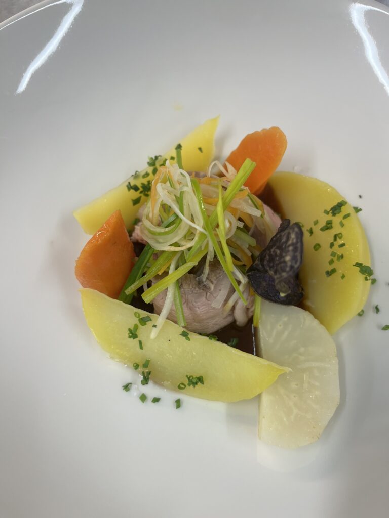 - Perlhuhn auf Kräuterjus – Beilage: Kartoffelwürfel, glasiertes Gemüse