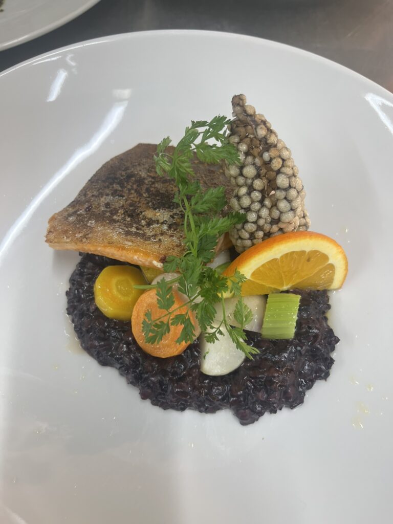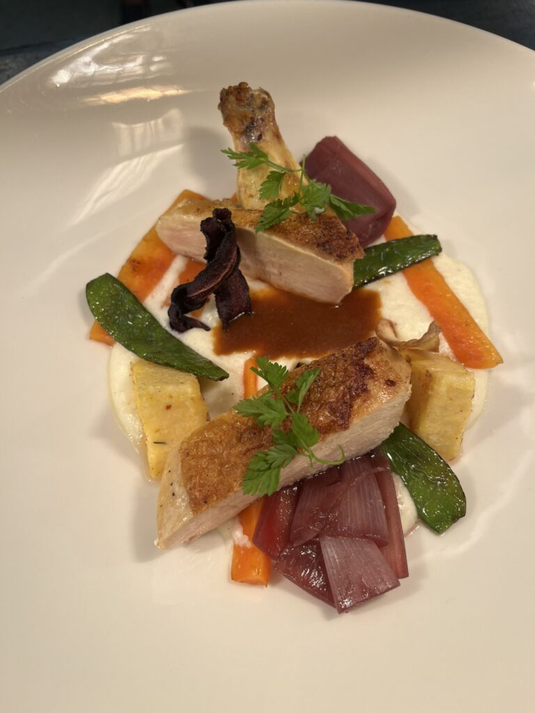 - Entenkeule confiert auf Rotweinjus – Beilage: Polenta, glasiertes Gemüse