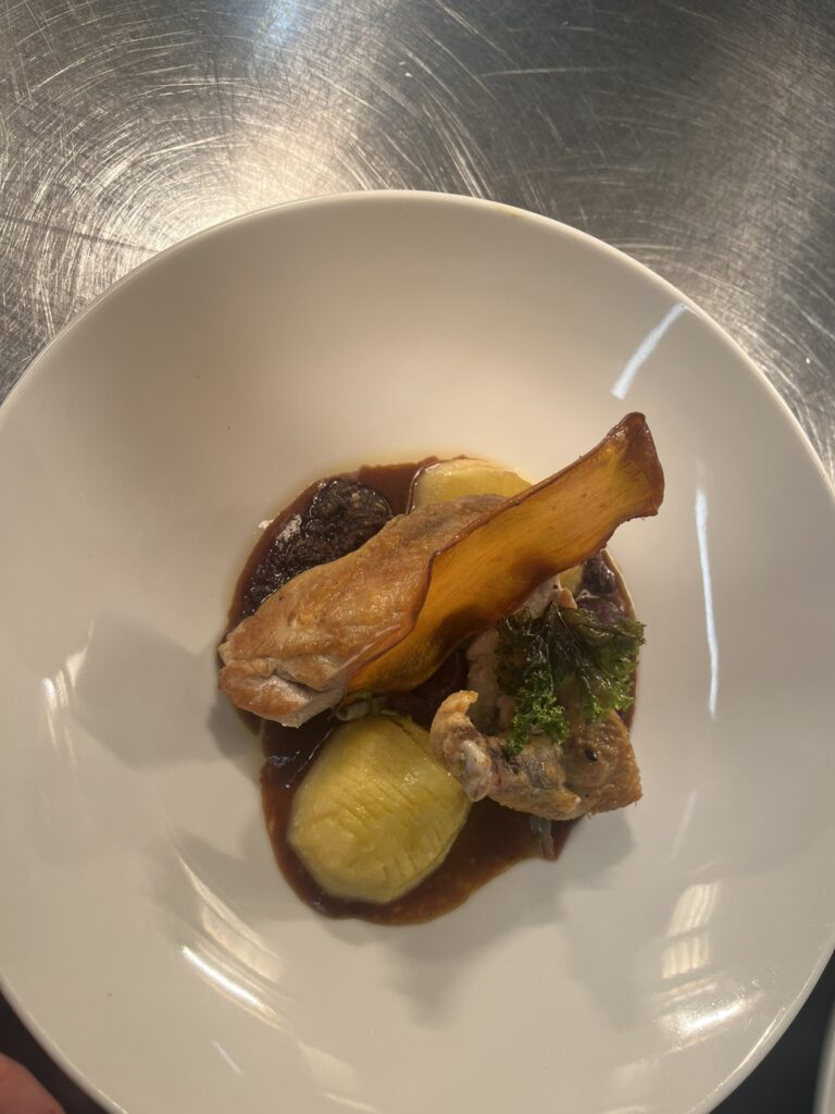 - Perlhuhn auf Rotweinjus – Beilage: Kartoffelpüree, Zuckerschoten
