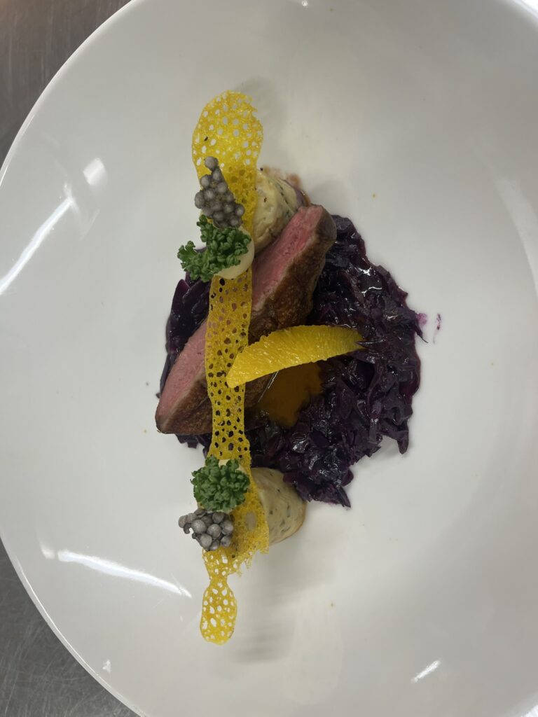 - Entenbrust in Orangen-Trüffelsauce – Beilage: Polenta, glasiertes Gemüse
