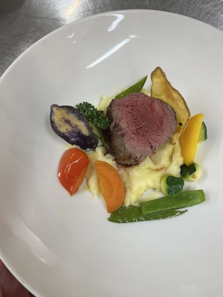 - Rinderfilet auf Safransauce – Beilage: Kartoffelpüree, Butterkarotten