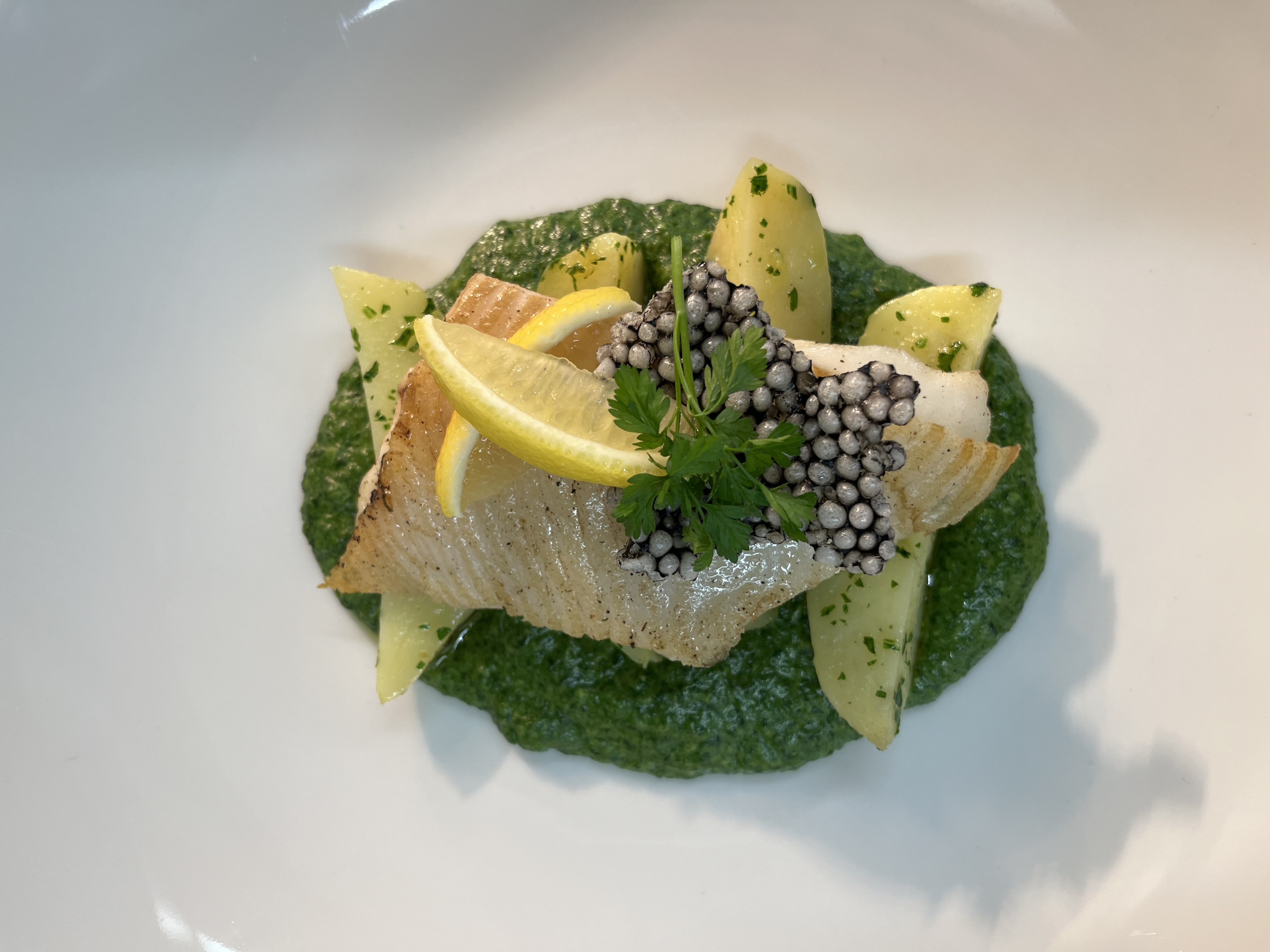 - Zackenbarsch auf Zitronen-Kräutersauce – Beilage: Kartoffelgratin, Zuckerschoten