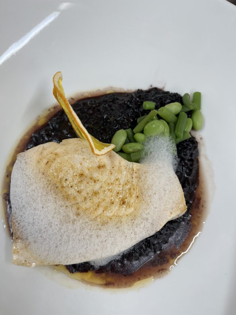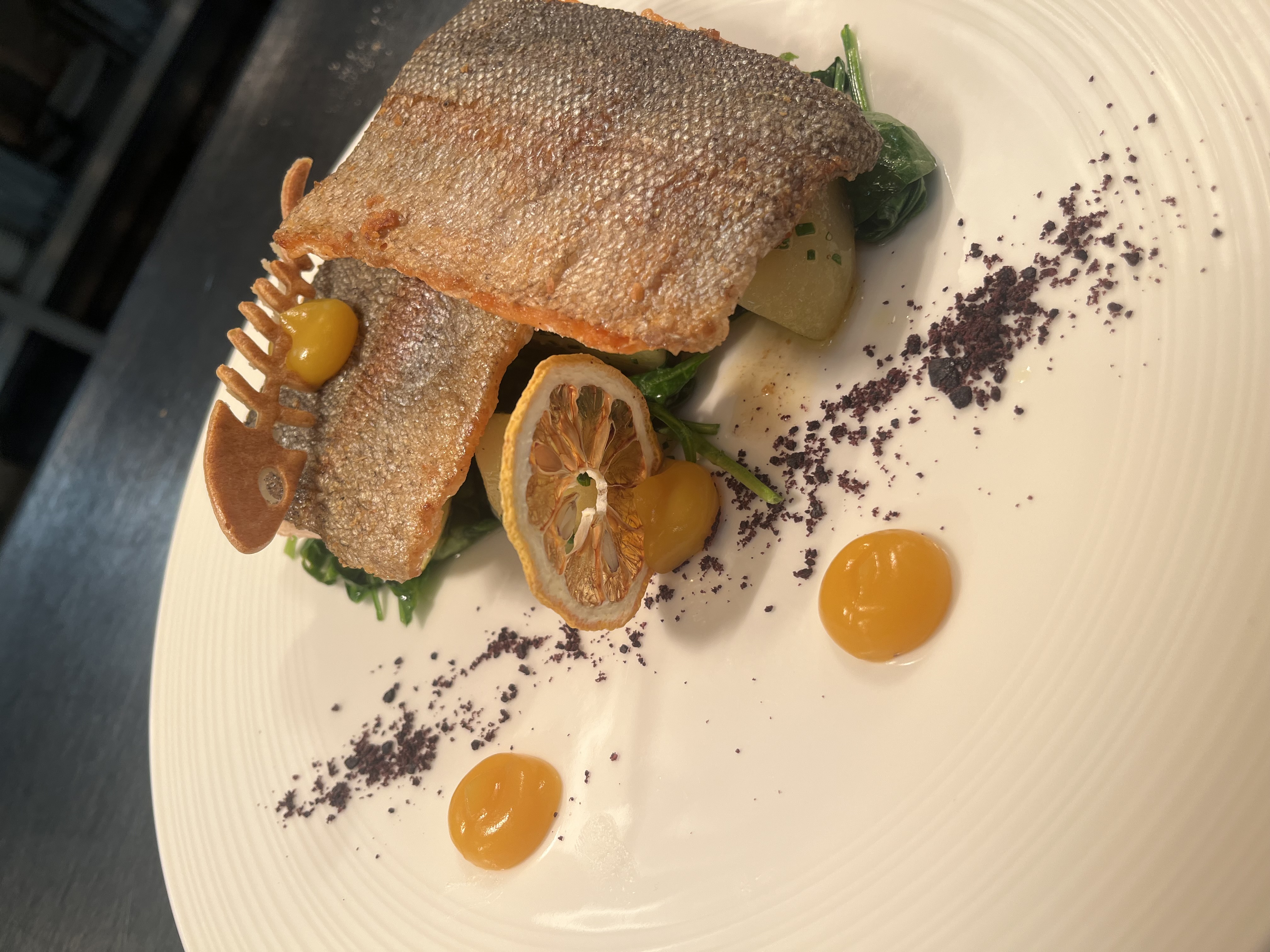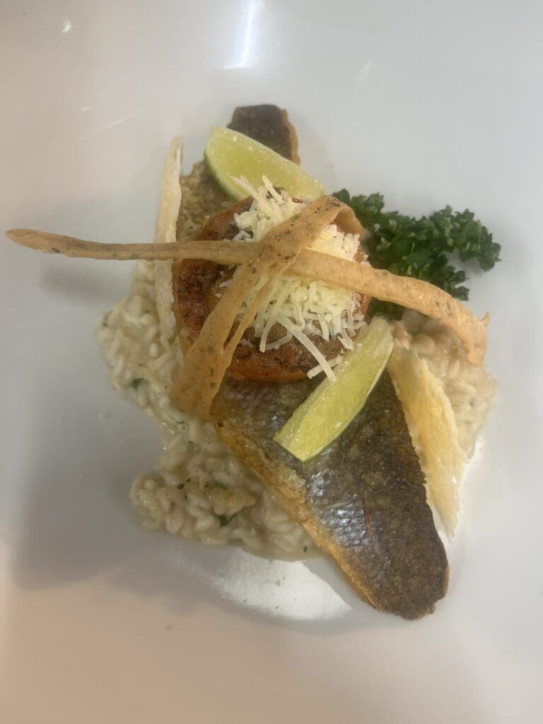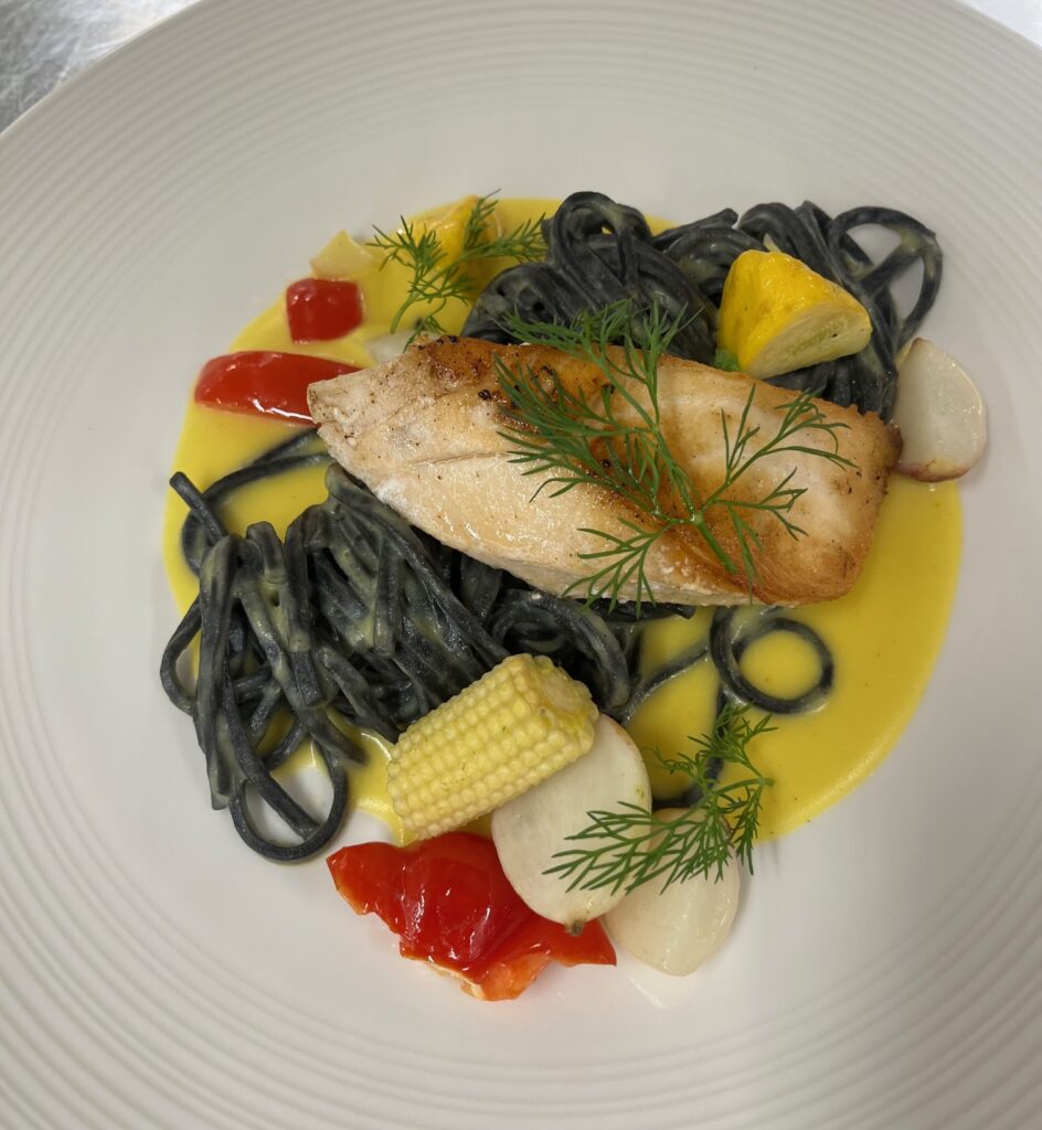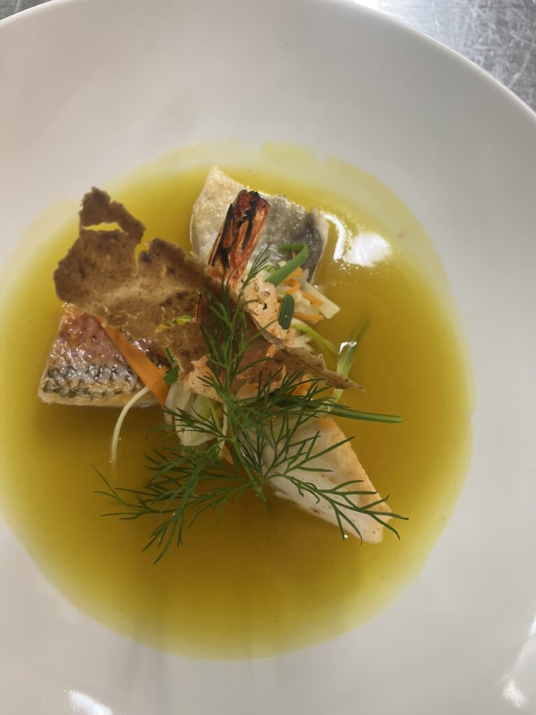 - Zackenbarsch auf Orangen-Safran-Sauce – Beilage: Polenta, Butterkarotten