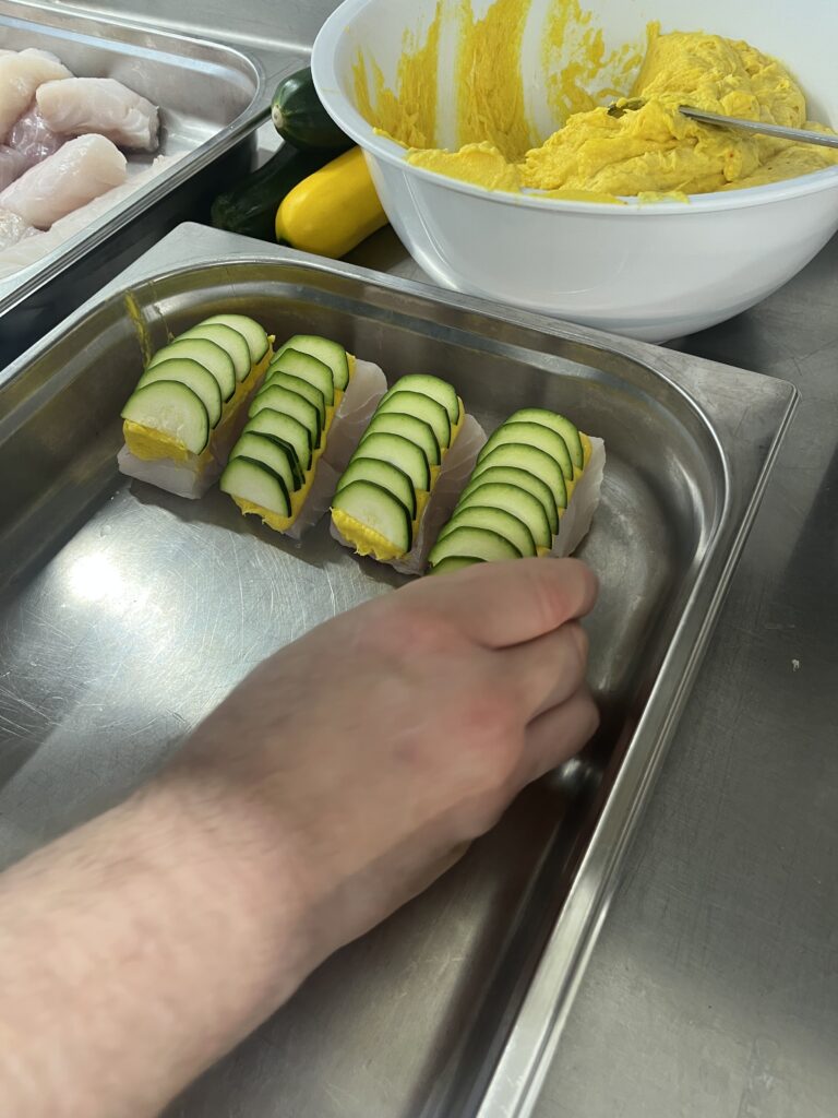 - Wolfsbarschfilet auf Fenchelgemüse – Beilage: Kartoffelgratin, Butterkarotten