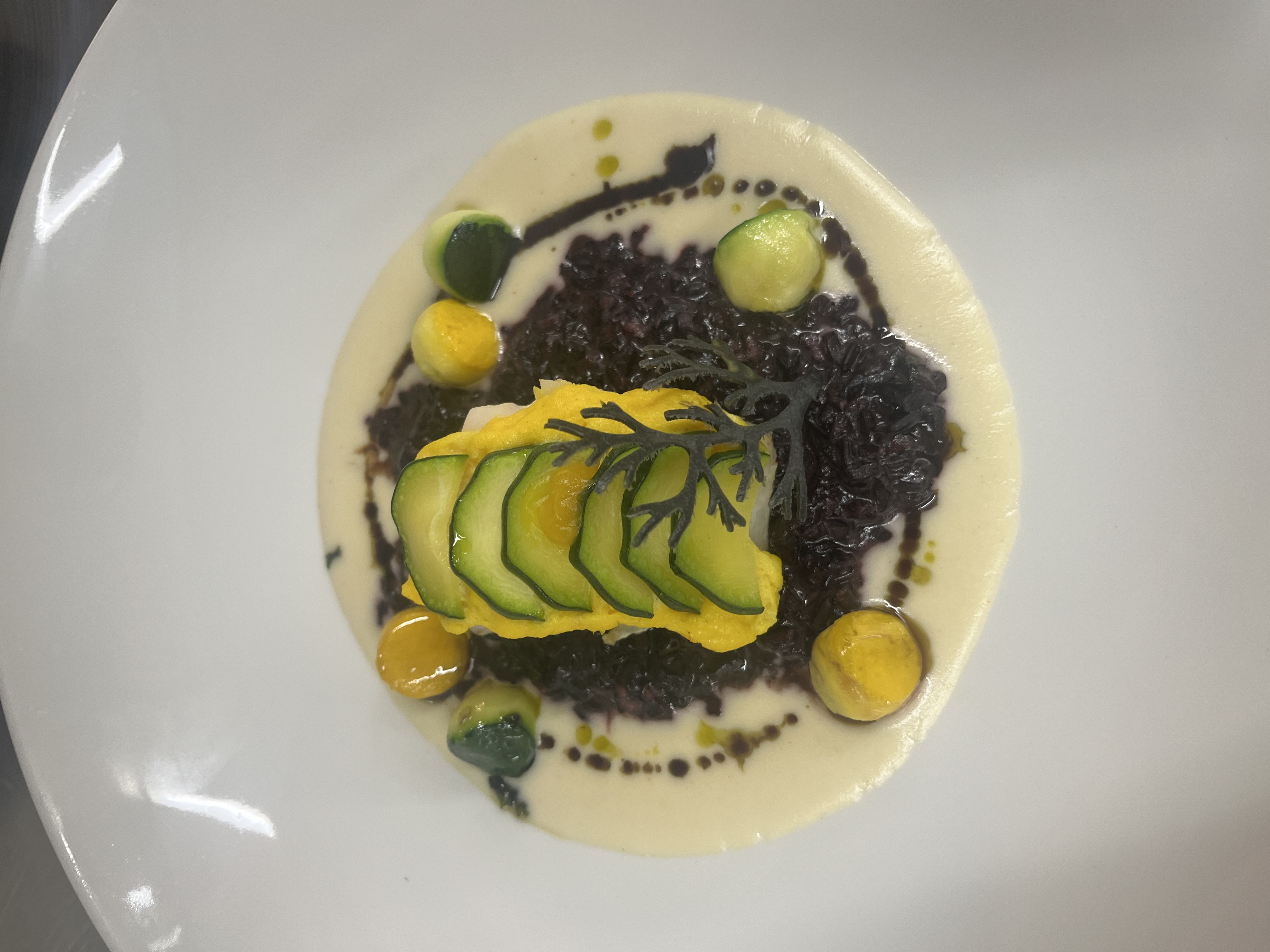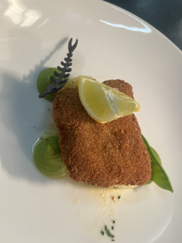 - Kabeljau auf Safrancreme – Beilage: Polenta, Zuckerschoten