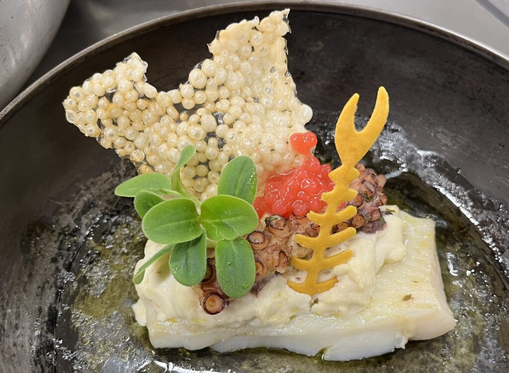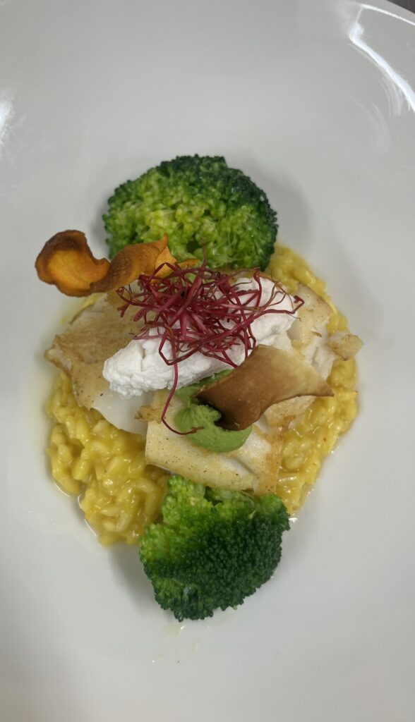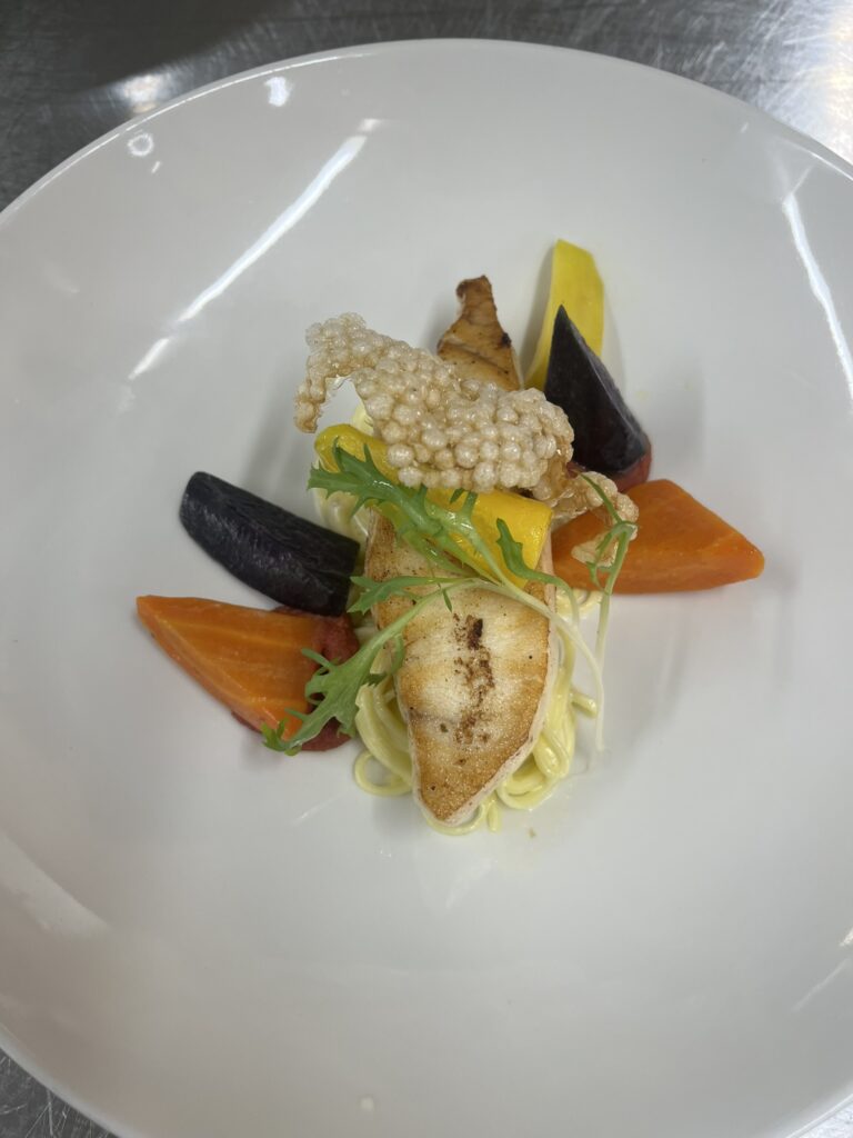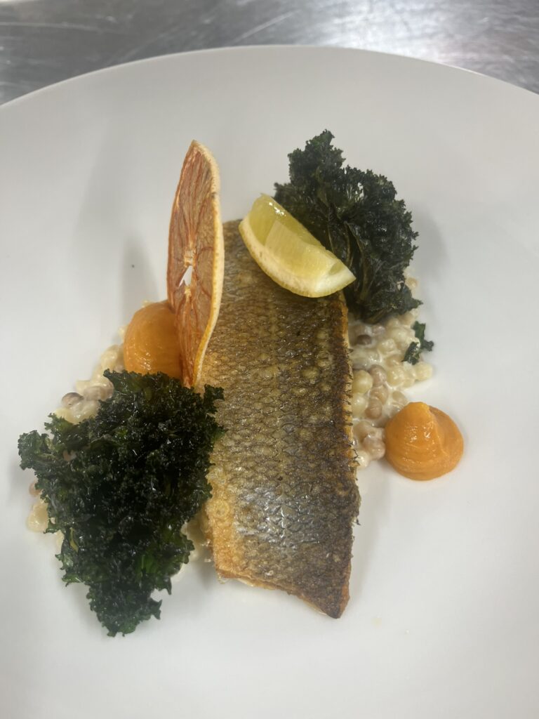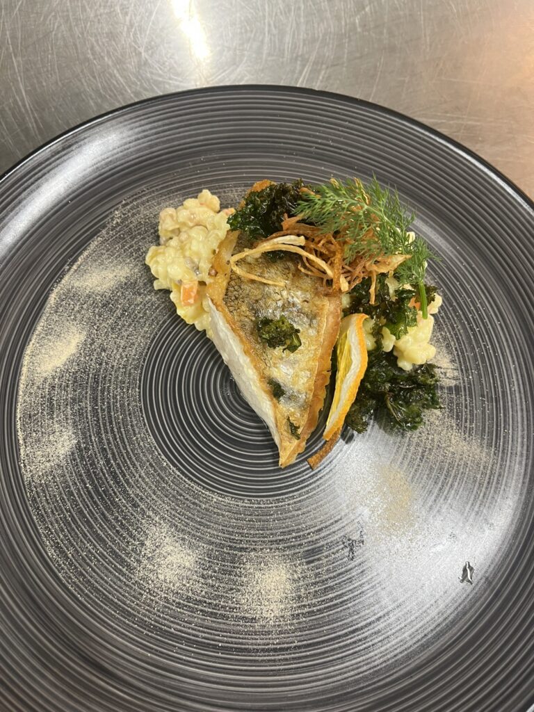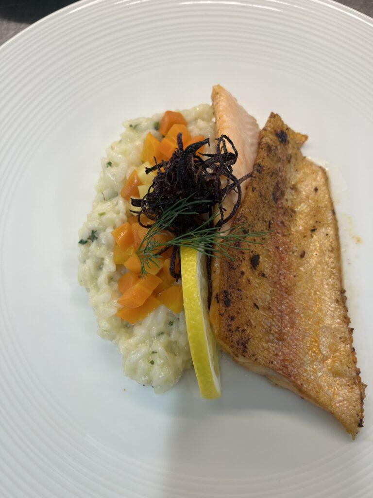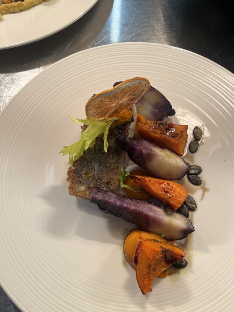 - Zackenbarsch auf Safran-Kürbis-Creme – Beilage: Polenta, Butterkarotten